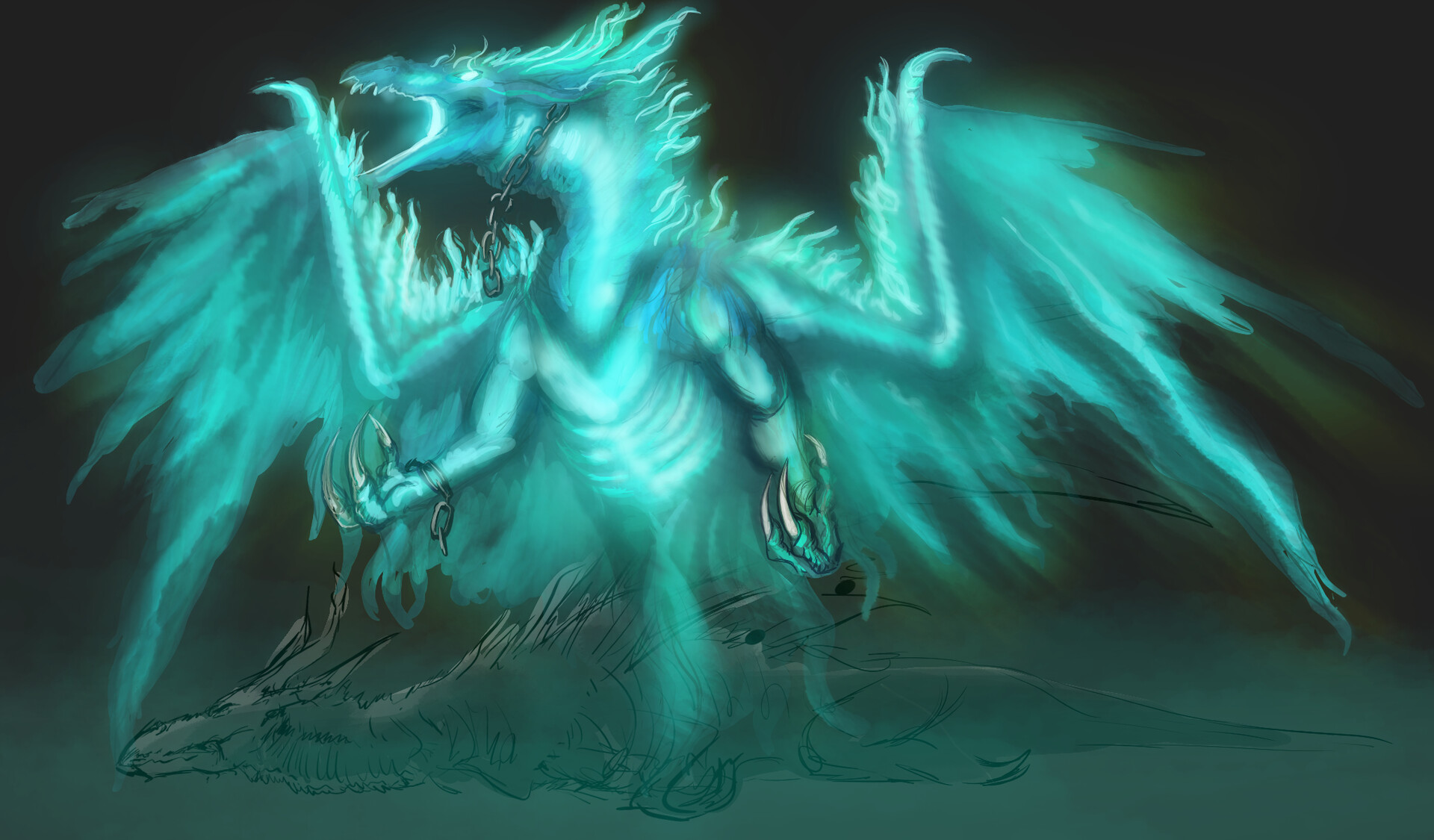 They take Deerix outside and Suicu casts a spell of Dragon's Breath on him and he runs around breathing fire. Suddenly a portal opens and a green translucent dragon steps out and addresses the Kobold "Didn't I say you should leave, little one?". They speak to the dragon and he introduces himself as Graexnarus the Ancient, or Graex for short. He was bound willingly to the Palace to guard the Great Engine and make sure it was not abused. He exists as a spirit but can turn corporeal at will.