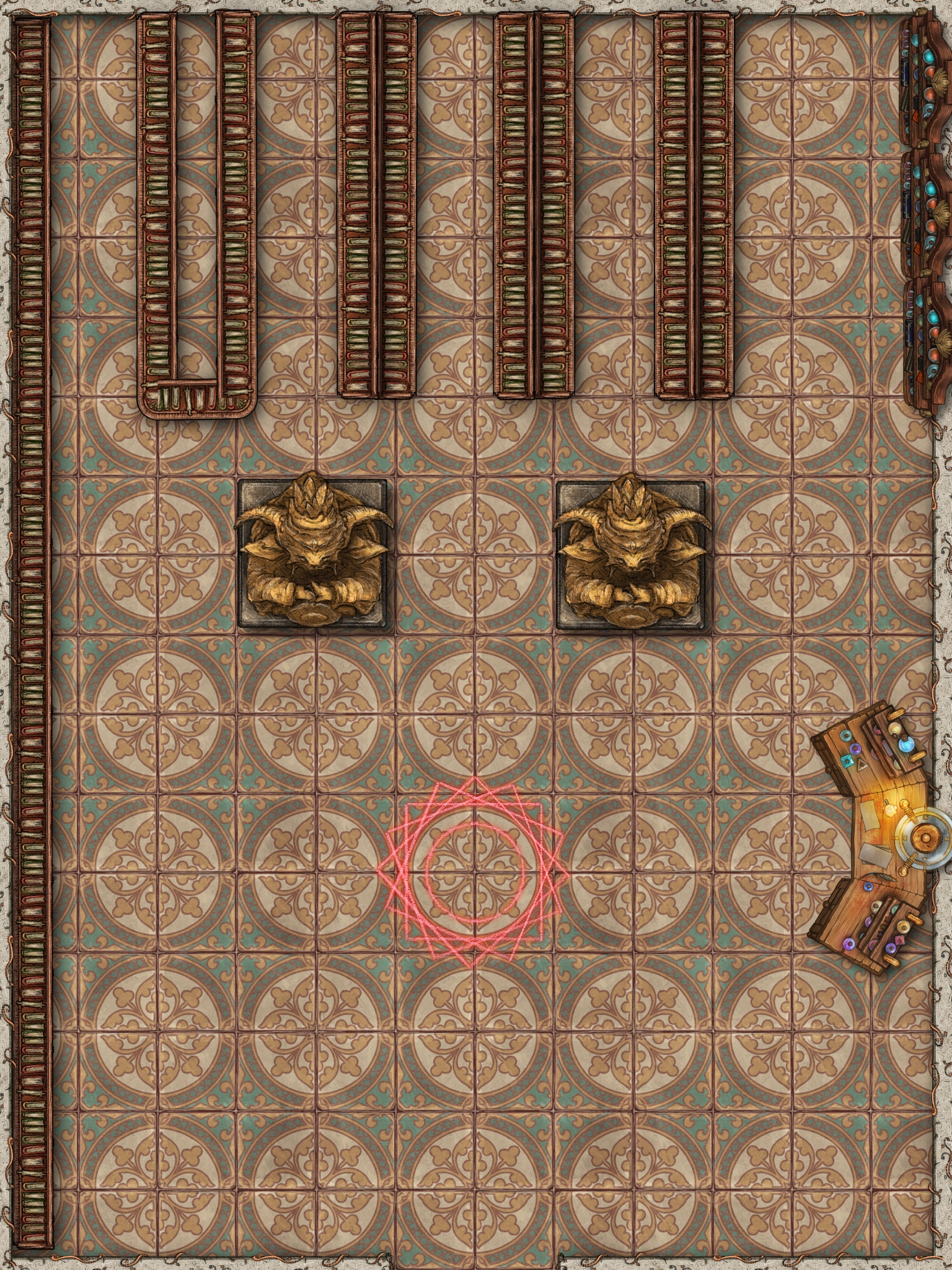 The party starts searching the library inside the palace and find a chamber filled with books and scrolls. On the floor there is a runic circle and Suicu after talking to Deerix notices that it has something to do with teleportation. For safety they tie up Deerix so he can't run off while they're reading books and investigating the room. Hiron investigates the alchemical station and find a number of recipes as well as a notebook with the name Alexandr written on it. It mentions at the end "Do not trust the Blue." Jock uses his new magical powers to translate the books written in strange languages and learns about the ancient world.