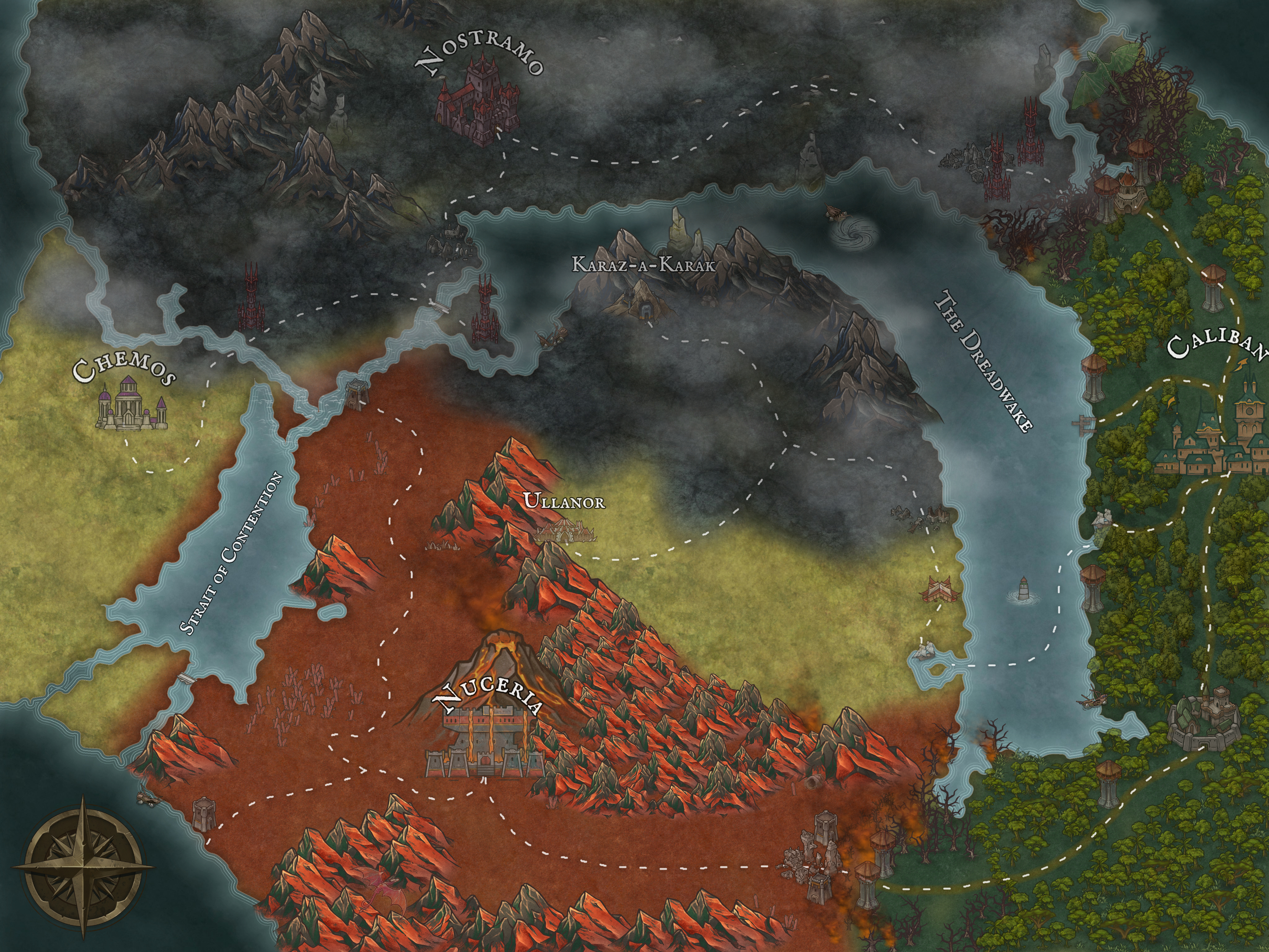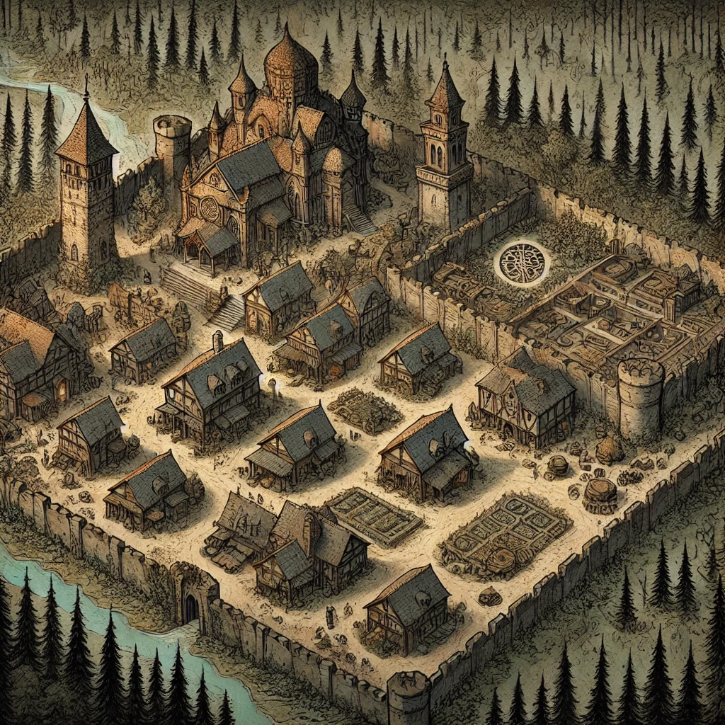 The lands of Caliban are a vast, shadow-haunted realm dominated by ancient, oppressive forests that stretch endlessly across the horizon. Twisted trees with gnarled branches form a near-constant canopy, choking the sunlight and casting the land in perpetual gloom. This dense wilderness teems with danger—monstrous beasts, malevolent spirits, and the remnants of an ancient curse that twists reality deep within the woods. Only a few bastions of civilization cling to survival on the forest's fringes. Villages like Thornhaven stand as fragile fortresses, their walls barely holding back the encroaching wilds. Travelers speak in hushed tones of eerie whispers carried on the wind, and paths that shift and change as though alive. The line between myth and truth here is perilously thin. Yet, for all its dangers, Caliban is a land of opportunity and legend. Its forests hold ancient ruins, long-forgotten treasures, and powerful artifacts hidden beneath the overgrown roots of time. Those brave enough to face its darkness can find both wealth and renown, though many have been swallowed by the shadows without a trace. The people of Caliban are tough, superstitious, and resourceful, relying on skilled hunters, rangers, and the occasional wandering adventurer to protect their settlements. As the mists thicken and rumors of dark omens grow, all eyes turn to the wilderness. Something stirs in the heart of the forest, and soon, your party will be called to face whatever horrors awaken within Caliban's endless shadows.