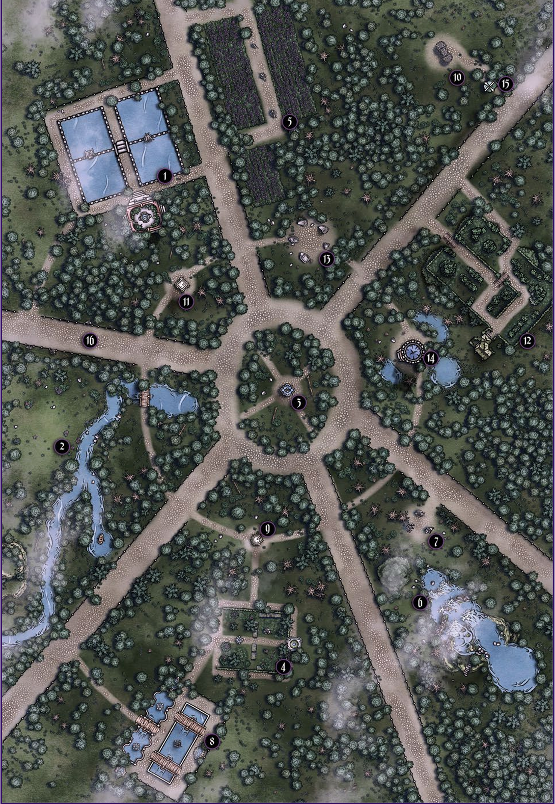 At the heart of Queen's Park Garden, you trek through the underground chambers of memorialized nobility, seeking exotic, tantalizing, and mystical eldritch lilies that have been jealously collected within a luminous cavern pond. Hundreds of snow white flowers gracefully float on the water surface, gently pushed by the wake of a tall slender woman garbed in a resplendent emerald dress who wades amongst her prized possessions.