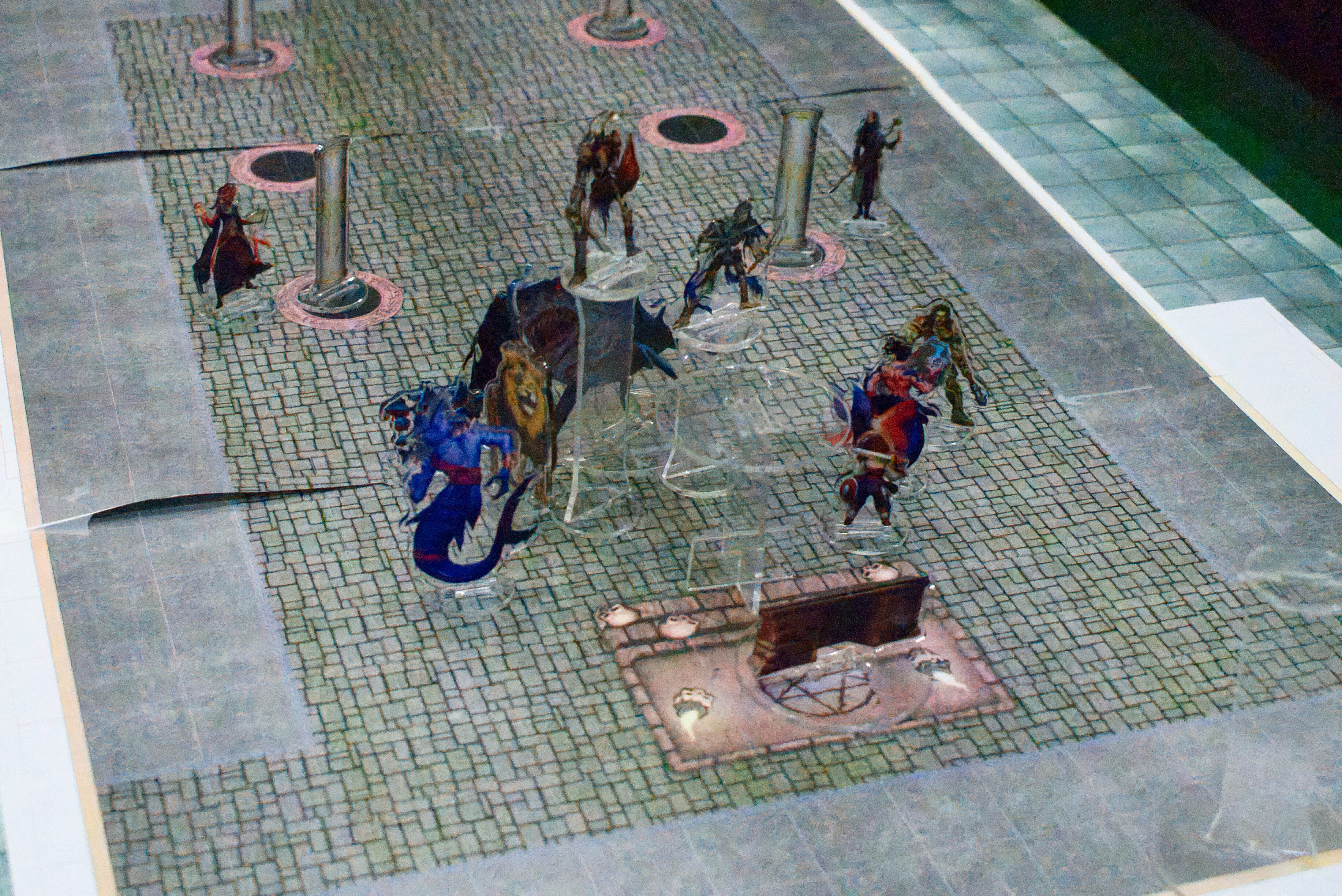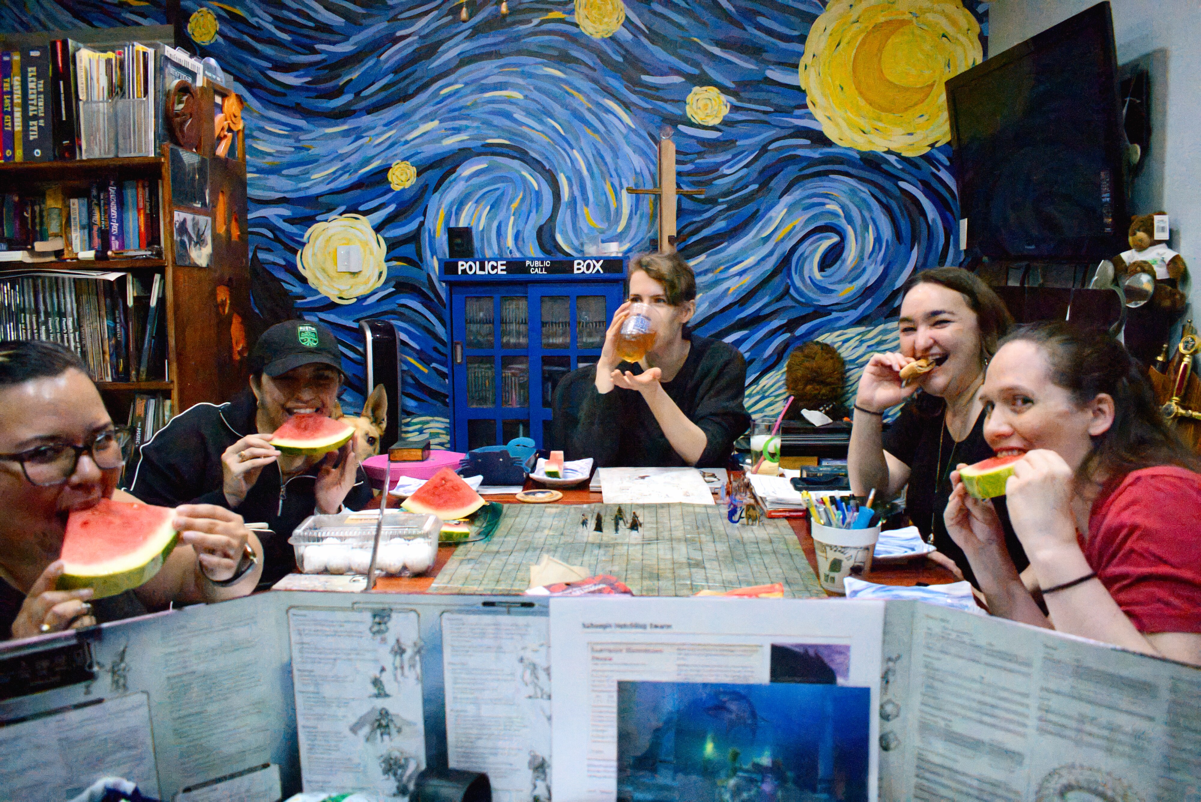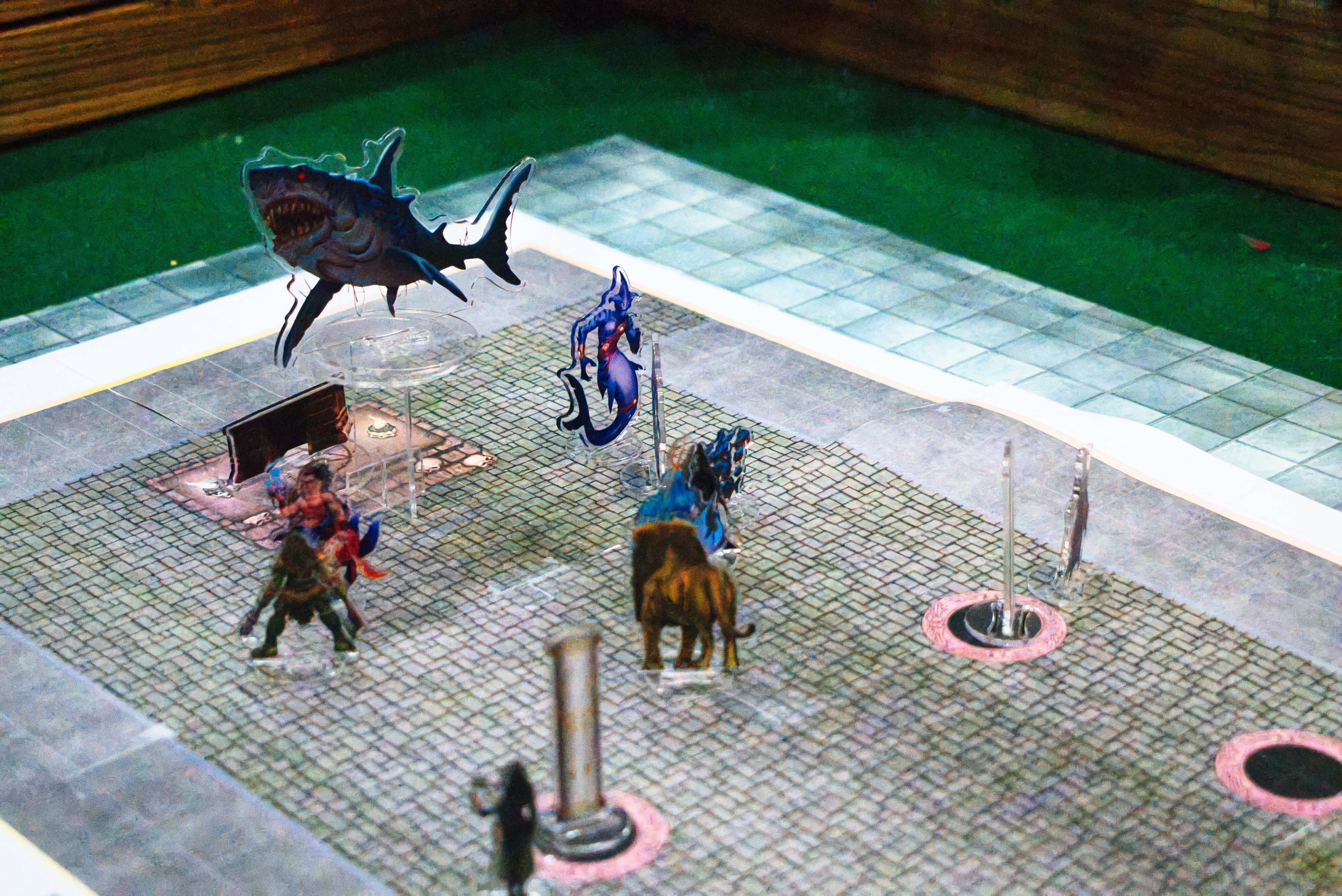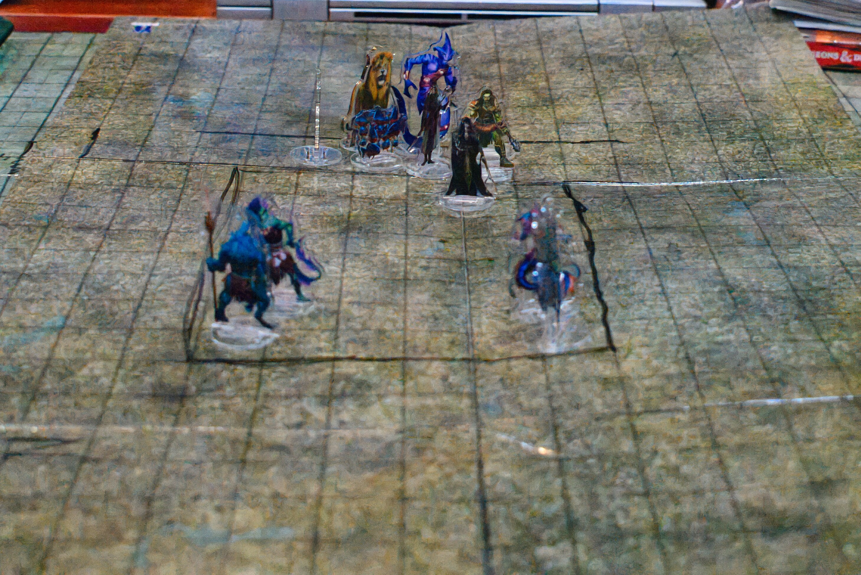 Earlier today, the try-hard misfits slunk through the lowest level of this Sahuagin fortress. They fought a few skirmishes, but silent information gathering was their objective. Having mapped the lowest level, the group headed back to the chamber where twisted and bloody shark-like humanoids litter the floor from an earlier battle. Ready to explore more of this sunken warren, Nar with a glowing pebble held in her mouth swims up the steep stairs. Upon reaching the summit, she sees a hallway that branches at the edge of her light some thirty feet away. The rest of the party follows along as Nar swims to the split heading west. Seeing a door to the south, the party heads there and Kyra slowly cracks the door where she peeks inside seeing roughly eight to twelve shell sharks swimming. Kyra immediately closes the door as she shares, "Nothing to see here. Let's keep heading west." Passing through double doors at the end of the hallway, the party enters a vast chamber that's thirty feet wide and extends beyond sight. Columns stretch along the south wall while many long tables are set north of the columns. As the party stalks deeper into the banquet hall, they see a niche to along the south wall. Approaching it, they see a large stone head sitting on the floor. Although battered and disfigured, the party easily identifies the lizardfolk face. Looking northward, the party sees an open doorway with a very large sahuagin sitting atop a throne while holding a trident. Next to him floats a female sahuagin holding a long staff topped with shark jaws and teeth. Before them stand three sahuagin with their backs toward the party. The party studies the scene for a moment as one of the sahuagin pleads before the throne, then the party silently heads back the way they came in. Returning to the first junction, the party follows the hallway south, then west, then south, then east, before heading south again to the next junction. A door stands closed in front of the party while the hallway runs west beyond their meager darkened vision. Still assessing the enemy forces, Kyra quietly cracks the door and hears the distinctive grunts and growls common to sahaugin speech. Peeking around the door, she silently steps forward a few feet before seeing roughly two dozen sahuagin donning armor inside the crowded barracks. She carefully ducks back, then gently closes the door urging the party down the hall. Fearing a patrol, the party hurries to take the first juncture southward that then weaves back and forth before reaching a tee junction where they choose the south passage again and quickly enter a large empty room with double-wide stairs leading upward with hallways heading east and west. Choosing the hallway to the east, the party follows it east, then south, then east again before arriving at another junction with the hallway continuing south and a door to the north. Opening the door, the party sees an empty thirty by forty foot room with dark green tiles and a seaweed bed in the northeast corner. Nar quickly picks a lone coffer where several harnesses, a locket, and a leather bag rest. Following the passageway south, the party soon turns westward and then north before ending at a wooden door to the north. Quietly cracking the door, they get a glimpse thirty-odd sahuagin before closing the door and retracing their steps back to the room with the double-wide stairs. Then proceeding down the western passageway, the party turns south and pauses by a door leading west where they can hear raucous sounds from within. Deciding to surprise the noisemakers, Jane busts through the door and sees four sahuagin wildly celebrating within the forty-by-thirty foot room. Recognizing priestesses and champions, the party immediately attacks surprising the celebrants. Jane, Karia, and Nar along with Kysh, Fysh, and Borgas quickly swim into melee and hack their opponents while Kyra commands her zombies to engage and Adlia chimes her bell for the dead. Mere moments pass before the sahuagin permanently rest on the floor. As everyone searches the room a roving patrol enters from the hallway attacking on sight. The party trapped within the room engages the sahuagin and coral smasher as they enter. For a moment, it looks like the patrol might overwhelm the group, but then Jane's axe cleaves open the champion and their moral breaks. As the waters ease, the party completes their search. Leaving the room behind, the party closes the door and swim south then west before opening a door to the north. Looking upon another empty bedroom, Nar quickly picks the coffer and the party collects harnesses, bag, and silver mirror. They quickly continue along the corridor south, then east, then back north where they inch open a door. Peeking through, they recognize that it is the same room they saw in the eastern corridor with three dozen sauhagin inside. Closing it softly, the party follows the corridor back to the double-wide stairs and then north before turning west and then back north. Reaching a long hallway, looking east, the party sees an alcove on the northern side. Approaching it, they see two large ornate double-doors. After inspecting them for traps, the party opens the doors as a weird chant washes over their ears. Repeating in that strange guttural language, three suaghin priestesses stand before an altar whose stone base is covered in carved shark eyes that stare outward in all directions. Then, suddenly, the party feels the water pulse against them as they sense movement above the priestesses. Slowly, their eyes drift upward revealing a humongous shark. With flick of its tail, the shark circles above the chanting priestesses. Awestruck, the party stares. Then, a priestess reaches into the bag within her hands and toss a small round object upward. The shark twists back toward the party as two heads bicker over the offering. This impossible shark has bifurcated heads! It is then that Adlia feels a divine presence filled with darkness wash over h