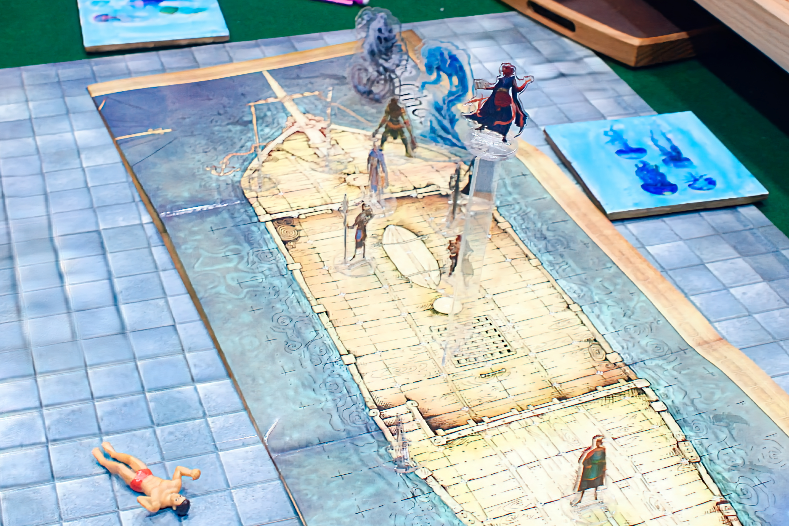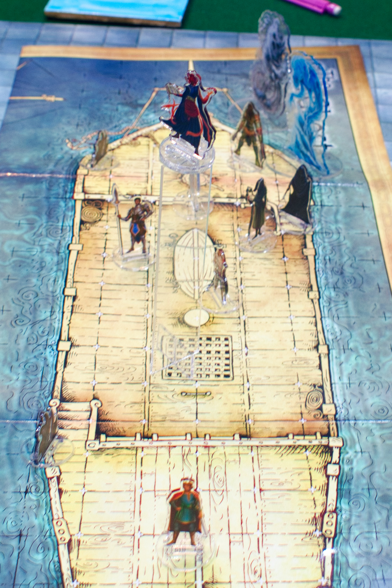 The water elementals slam and slosh over the edge of the bow, but are quickly beaten backward by the party. They surge forward again, but again the party repels them and then the elementals just collapse the water crashing back downward lifeless into the Azure Sea.
