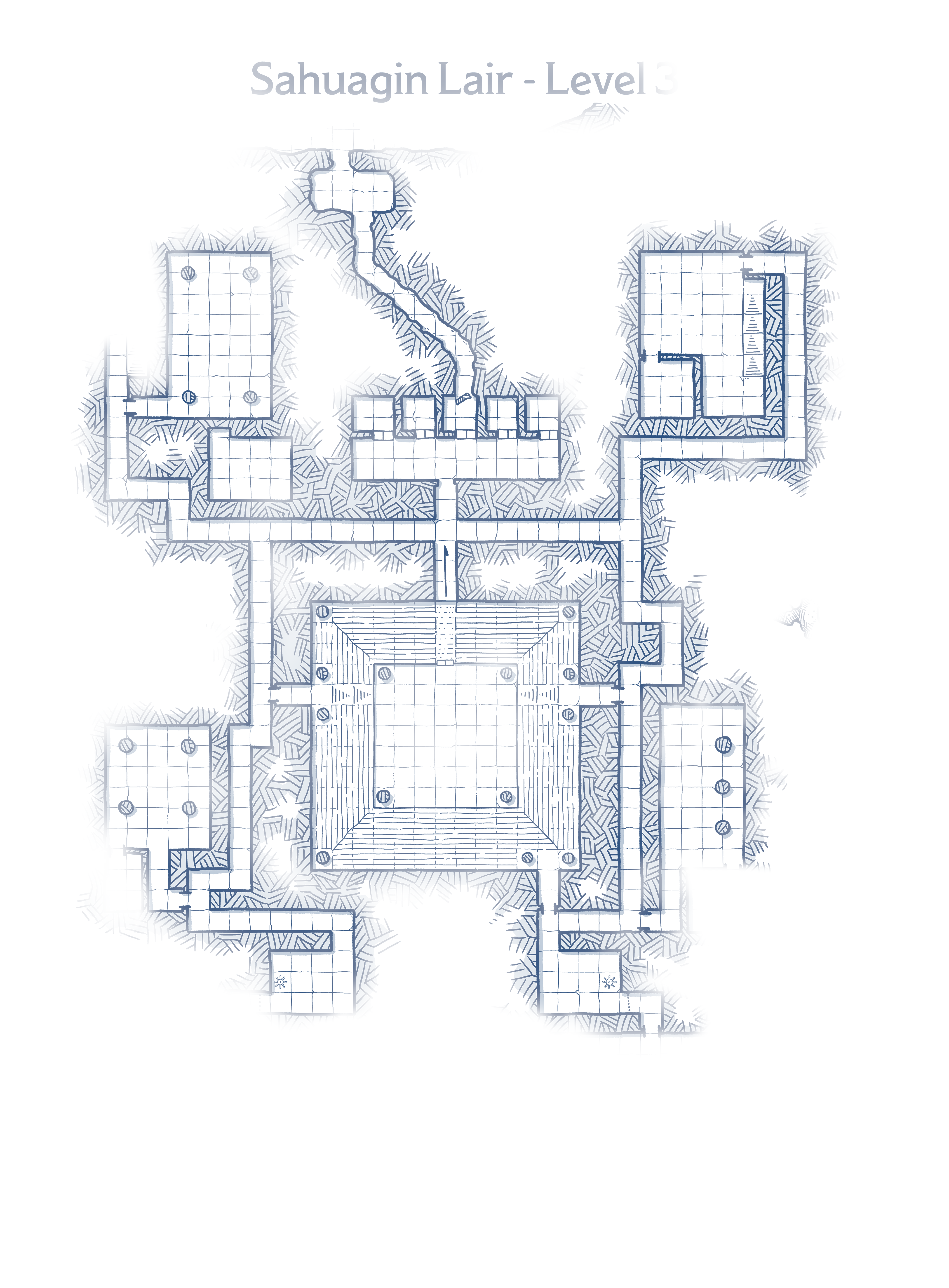 Previously, the try-hard misfits scouted the western edge of the bottom level of the fortress evading contact until they encountered several Shell Sharks in a storage room. After defeating the sharks, Karia explored a hidden room and was temporarily isolated as the rest of the party dug her free. The try-hard misfits leave the store room behind and head toward the intersection of hallways just south of the torture room. Along the way, Kyra complains, "We've been most inefficient in our exploration here. I can feel time slipping away. We need to speed up or we'll be discovered." "Should we split up?" asks Karia? Nar volunteers, "I could scout south while Karia scouts north?" Kyra responds, "Maybe, but even though I could turn you both invisible, Nar would still be seen by the light she carries. Maybe it's best for us to stick together and just be cognizant of our time." By now, the party's exploring the eastern branch of the hallway and reach a t-junction where the hallways go north and south. The party turns northward following the hallway north, east, and north again before turning back west toward a room opening beyond. They nudge forward until Karia peeks into the room where large coffers lining the north and west walls draw her eyes before then identifying several groups of sahuagin spread throughout the large room that extends beyond her sight, including a twisted one at the bottom of stairs leading upward. Suddenly, the champion, who's surrounded by coral smasher sahuagins, alerts the room as he swims toward the party. Nar leads the attack as the party pushes into the room. The coral smashers try blocking the entrance as Fysh and Kysh engage while the champion flanks them and then is flanked by Jane. Two larger sahuagin move to a protective stance in front of the sahuagin with a twisted body that flees up the stairs. Morgana swims into melee with her two short swords before slashing the sharkfolk. As the party spreads deeper into the room, the sahuagins lose their advantage and quickly succumb to the overwhelming numbers of the party. The larger sahuagin move defensively, but Nar and Karia are able to engage them as Kyra and Adlia toll their bells from the edge of the room. Finally, the battle ends as the final deep diver sahuagin dies. Knowing the escaped sahuagin will return with reinforcements, Karia and Nar quickly open a few coffers pulling out a harness and few coins while Kyra has Jane, Adlia, Borgas, and Kysh stack sahuagin corpses at the foot of the stairwell. No sooner are the bodies stacked up, then a sahuagin patrol starts to descend the stairwell. Kyra unleashes her arcane energies animating four of the newly deceased sahuagin bodies while ordering Steve, Bill, Stanley, and Jeff to engage their former compatriots at the top of the stairs. These zombies immediately advance up the stairs and fill the ten foot tall passageway while striking at the closest sahuagin enemies there. Invoking her Manta Ray cloak, Nar quickly joins the zombies and, with a quick flip of her rapier, kills a sahuagin before gliding back downstairs. With this wall of protection, the rest of the party hunkers at the bottom of the stairwell and efficiently destroy the incoming raiding party from afar. As the last of the sahuagin sinks softly to the ground, Karia and Nar resume emptying the thirty six coffers along the walls. The party then opens the door in the southwest corner and discover another chache of weapons. Leaving nothing behind, the party then retraces back to the intersection and proceed south wending east and west within the fortress before passing another entrance to the arena and continuing southward. Finally, they reach in another t-junction runing east-west. Looking to the east, the hallway goes through an archway and then turns northward. The western hallway ends at another t-junction. Heading east, the hall turns northward before expanding into a room where guttural growls and grunts echoes into the hallway and indicate a sizable group of sahuagin there. Kyra spends a few minutes disguising herself to appear more sharklike and then inches toward the room where she identifies about two dozen sahuagin of various types before easing back out in the hallway. Quietly she relays the information and the party heads westward toward another t-junction. Reaching it, the north passage leads into the arena and the southern passage leads to a guardroom where several sahuagin and a couple of champions are idly relaxing. Kyra grins as she sends the remaining zombies, Bill, Stanley, and Jeff into the room standing close to one of the larger sahuagin. Then Nar uses her cloak to glide up to a sahuagin unleashing the surprise attack. The zombies claw at their opponents as the rest of the party engages from the corridor. Claws and swords ring out as the two forces clash together, but within seconds the sahuagin lie lifeless on the stony ground as the party explores the room. The eastern edge of the room has a passage leading onward blocked by closed metal gate. She tracing the gears to the mecanism on the northern wall and then notices a net rigged in the ceiling of the hallway. Nar fumbles with the knot tying the net as Kyra reaches above her and slashes it, allowing the net to fall harmlessly in the hallway. The party considers the noise the gate will make, then pauses as Karia listens at the gateway. From beyond, she hears a low constant hum of growls and grunts that indicates a large group of sahuagin lie beyond. This likely matches to their map of a large room opening out toward the Azure Sea. Deciding they have enough information, the party decides to leave the gate in place and head back northward.Rewards Granted