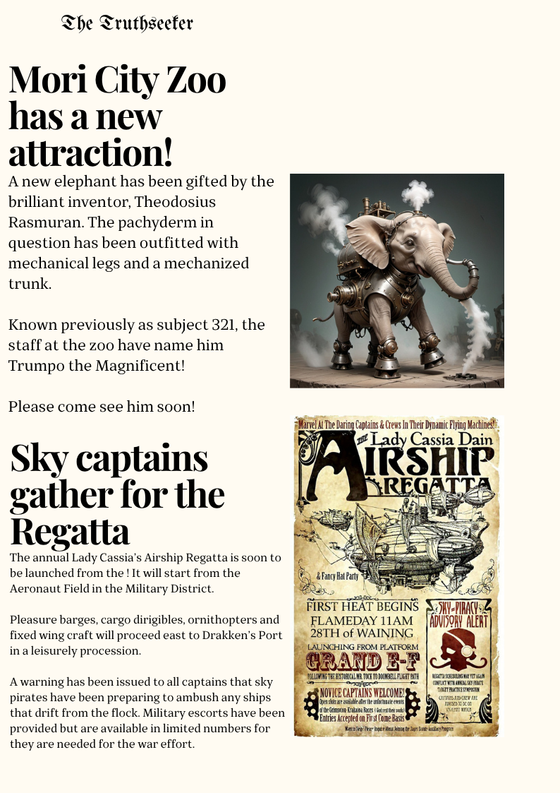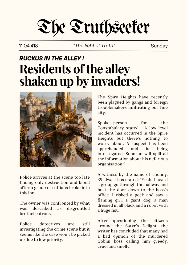 The party starts in the garage of a large manor in the Spire Heights. They travel speak with Lysandra and Tiberius, learning that they suspect a traitor. A likely suspect is a goblin by the name of Thresher who owns a brothel in the Smuggler's Alley behind the Merchant's Ring. But first they should secure the documents with compromising information on the city's nobles and the wealthy.