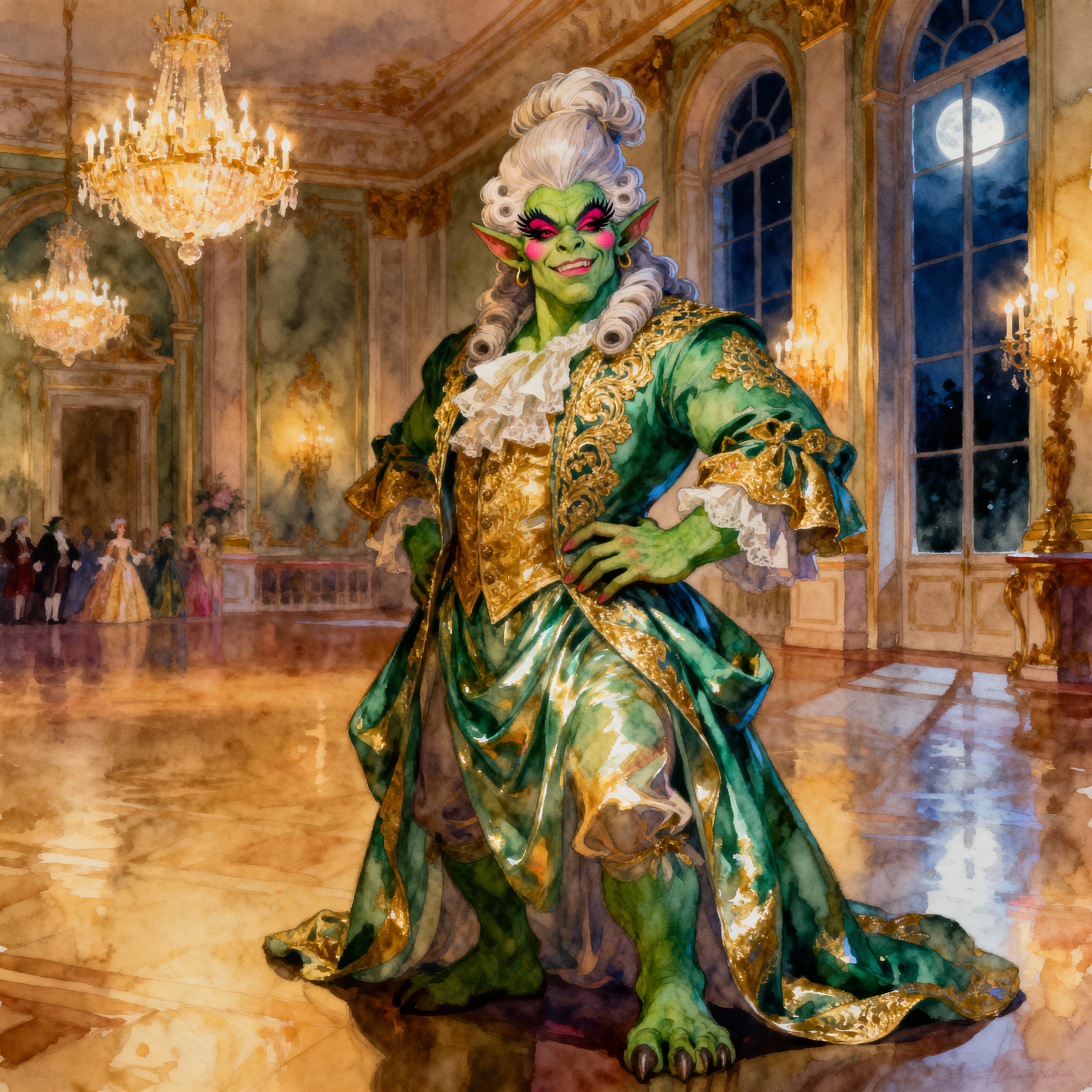 After breakfast by an intricate machine they set out to the Merchant's Ring in the Rovers in the garage with tinted windows to stay sneaky. They leave the vehicles at the Merchant's square and go into the Alley. After awhile they come upon the rundown building Satyr's Delight. They go inside and meet with an Orc in drag who has a flirtatious attitude.