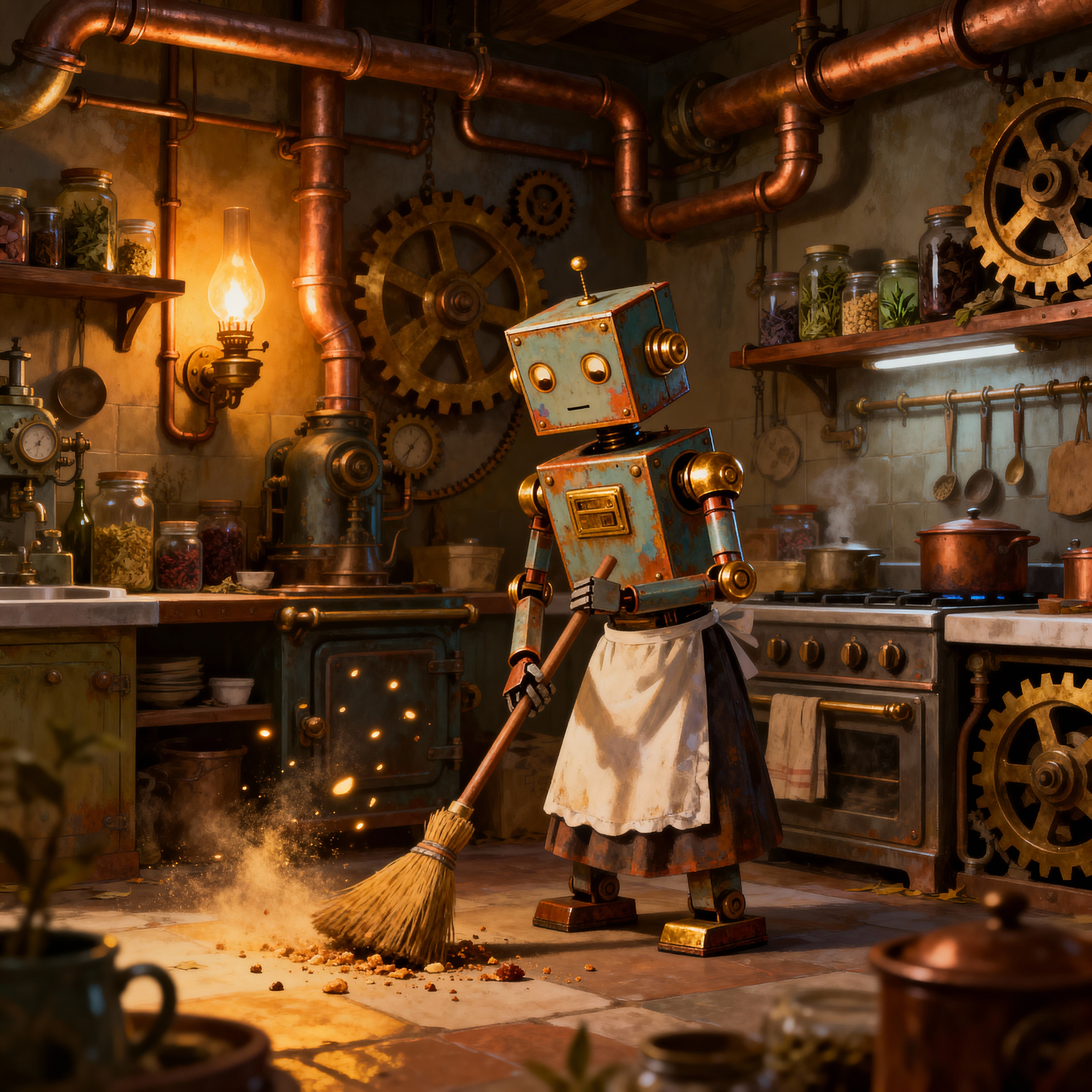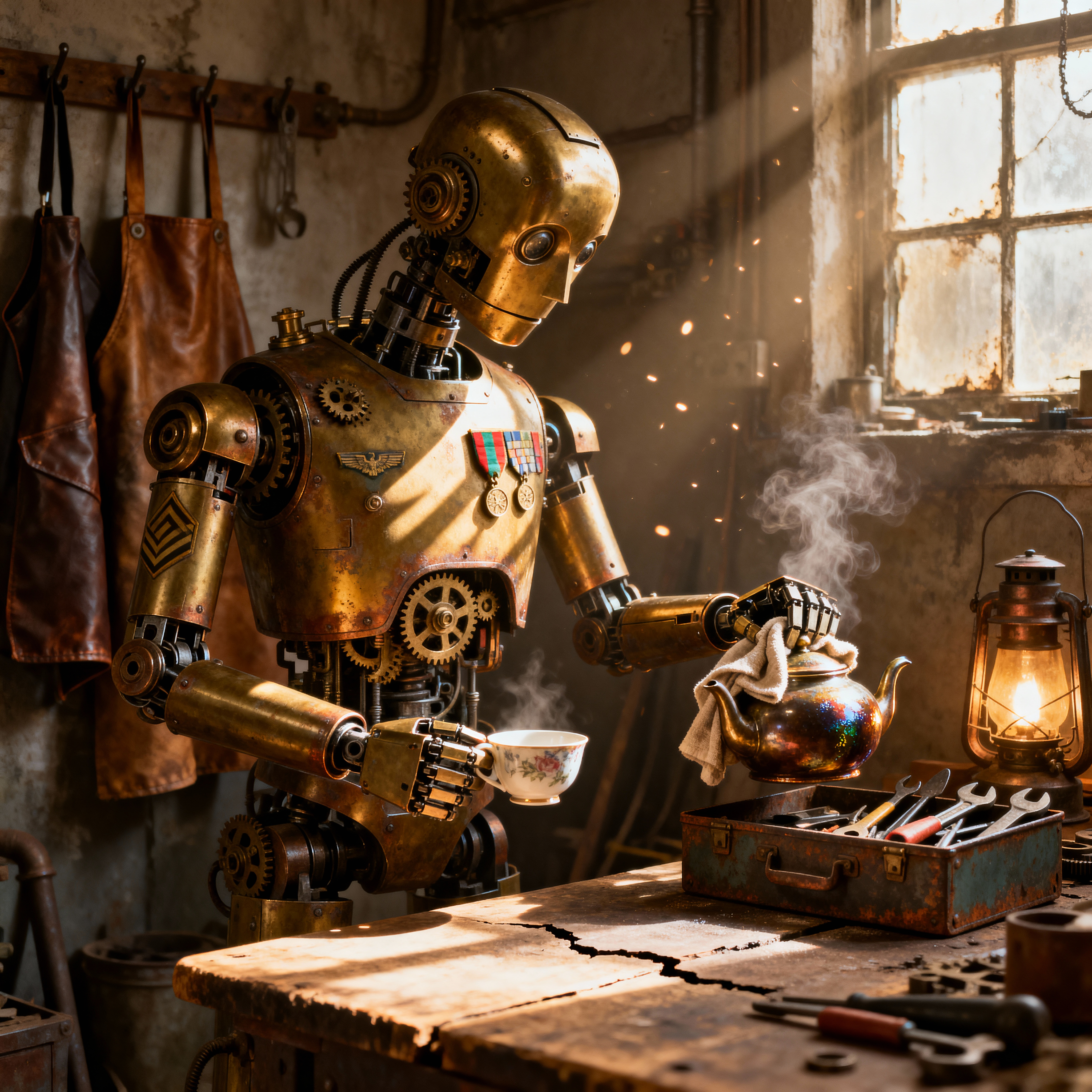 They move through the mansion and climb the stairs to the second floor. Seeing many strange devices some of the new electric lights, a phonograph playing a recording of an experiment and approaching from afar they see a robot, a Warbot, approaching. He offers them tea and biscuits while introducing himself as Destroyer Unit 21.