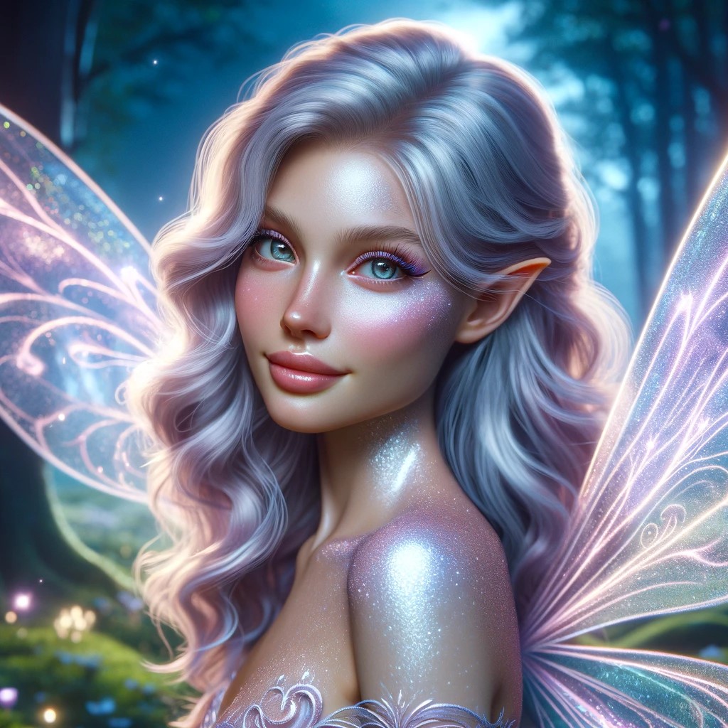· Sieht aus wie 25, helle Silber schimmernde Haut, wellige lila Haare