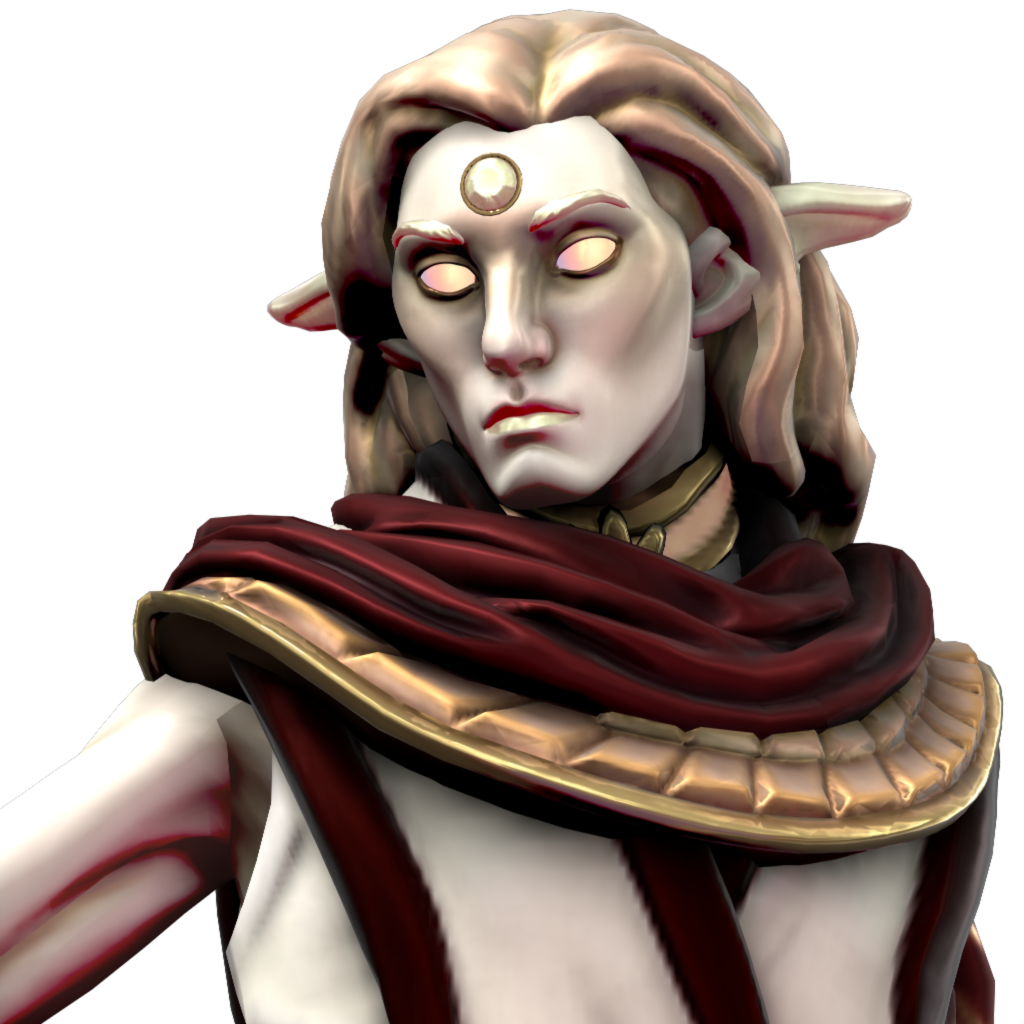 Traditional Adrean Farragist garb. Plenty of reds, whites and golds for a regal, important look. Topped off with a star medallion around the waistcloth. The wrist bangles represent the infinite wisdom of the stars. An outfit no longer befitting Wim.