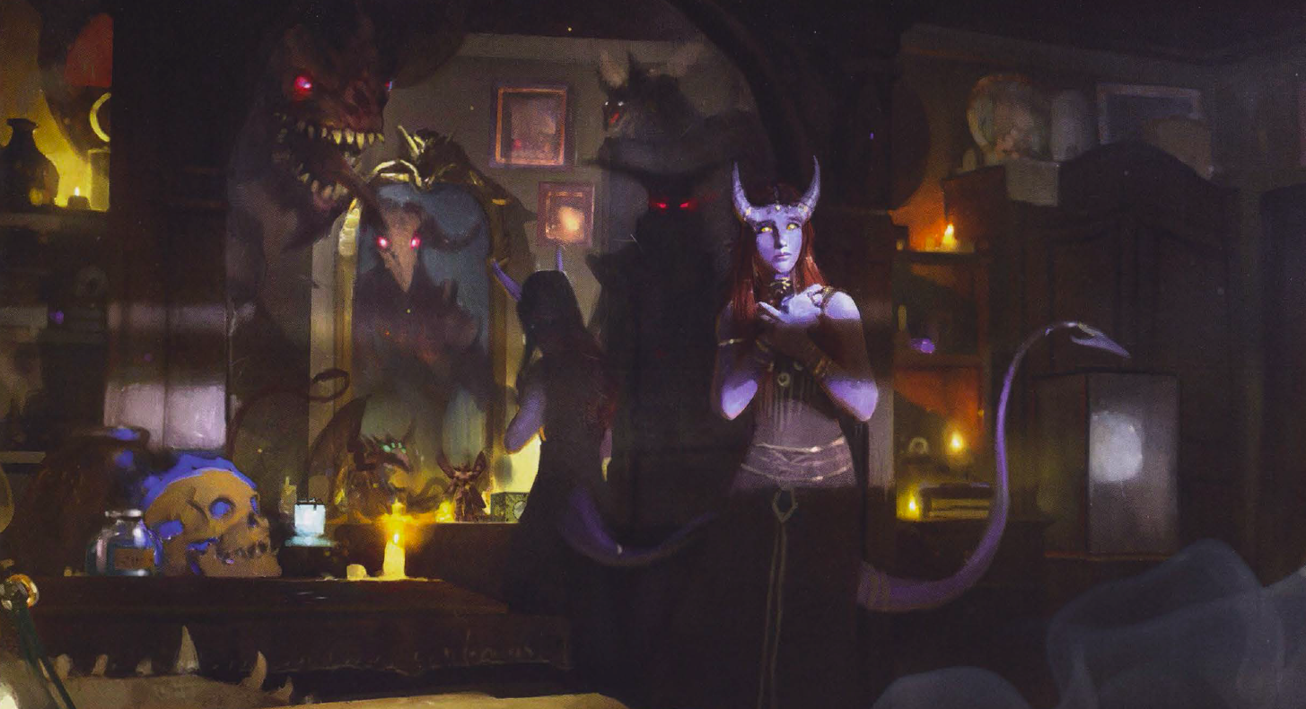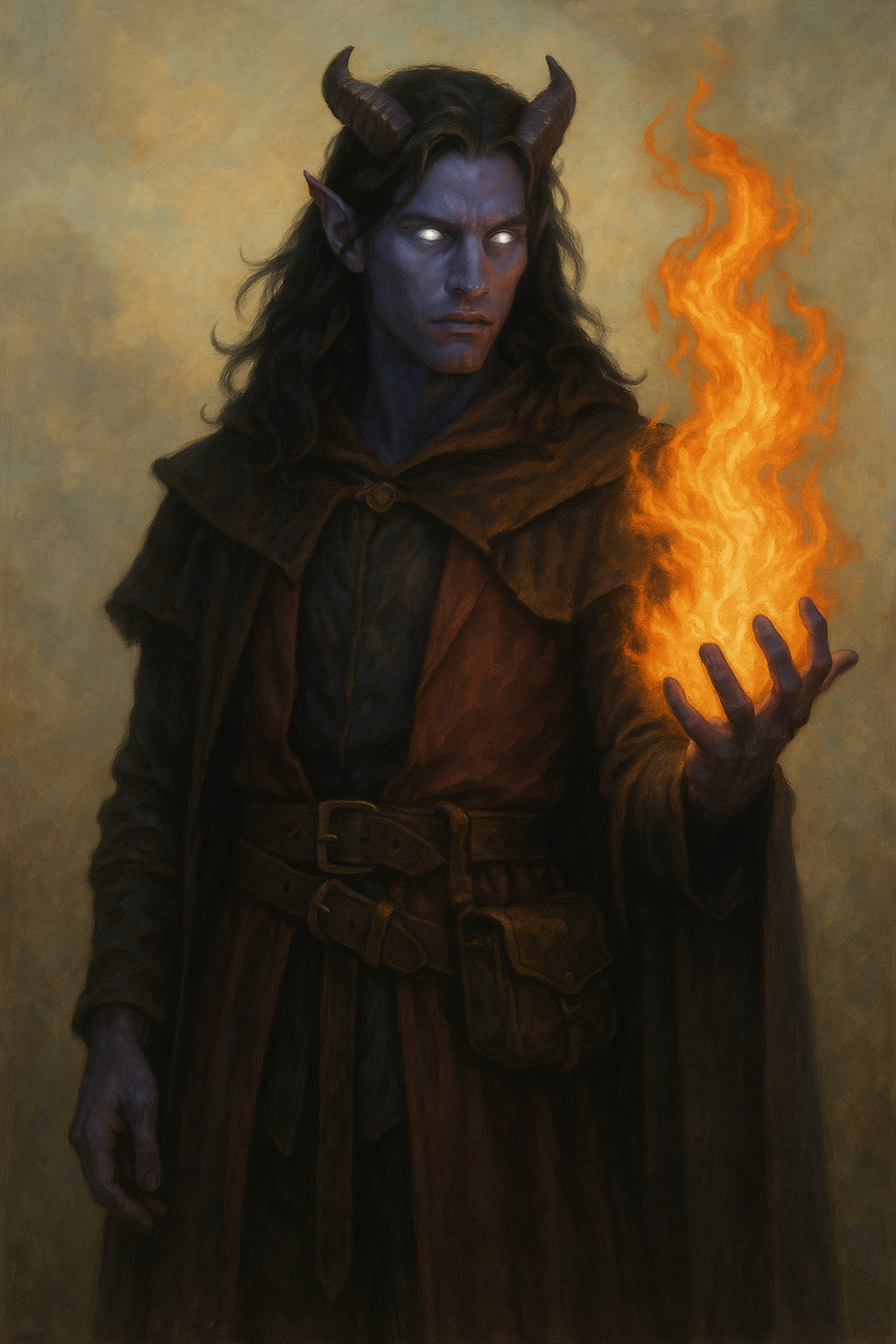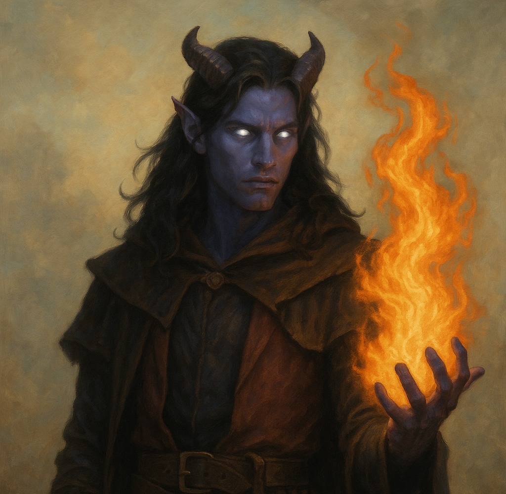 Who he is: An older tiefling who long ago stopped hiding their horns or their power. Dressed in rich crimson silks and unafraid to sneer at authority. A warlock who claims to serve an archdevil—though whether that’s true or just bravado is unclear.