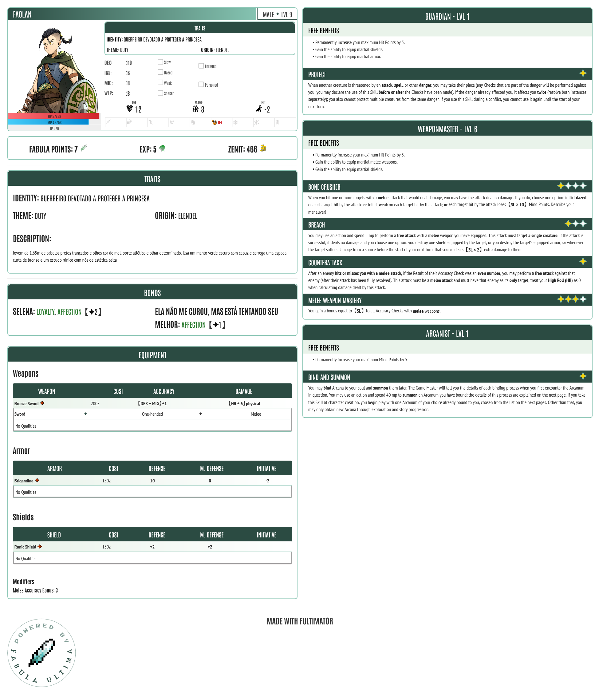 03:52 am - 06.11.2025A batalha começou antes mesmo que eu entendesse o que estava acontecendo. Do nada, uma guerreira surgiu atrás dos inimigos — alta, forte, com orelhas e feições que pareciam de uma raposa, mas... com um aspecto bem mais selvagem. Lutava como se tivesse nascido praquilo. Por sorte, estava do nosso lado. Durante a batalha, protegi a princesa o quanto pude, mas paguei o preço… levei golpes demais. Se não fosse a magia de cura da pequena Umi, eu teria caído... e falhado novamente... Sorush também quase não sobreviveu; uma explosão mágica atirada de um dos esqueletos o arremessou contra a parede, e o teto desabou entre nós. Mesmo assim, vencemos. A nova guerreira se apresentou como Zurda, capitã de Drage Alsterya. Procurava seus companheiros, os mesmos cujos corpos encontramos na tumba. Foi um momento difícil… Não sabia o que dizer além de "sinto muito pela sua perda". Os Herdeiros têm que ser parados custe o que custar! Sorush acabou achando uma estranha máquina com espaço pra colocar uma das gemas que vimos no mural da caverna. Havia 7 no mural e uma delas tem o mesmo formato desse espaço na máquina, outra era a gema do céu! A mesma ligada ao poder de Selena. Talvez isso tenha relação com os arcanos… e com o que aconteceu em Eledel. Voltamos a Ávila pra perguntar a Dao se ele sabe de alguma coisa, mas recebemos a terrível notícia que ele havia tirado a própria vida. Ele deixou uma carta de despedida e nela ele mencionava que a antiga arma de Drage Alsterya, aquela que Zurda procura, estava nas mãos de seu amigo, possivelmente o mesmo homem que aparecia ao lado de Dao em uma foto antiga. Decidimos procurá-lo em Maralto, pois parecia ser o cenário da foto. Mas antes, tivemos que escoltar os aldeões até o Forte Oris. Foi uma marcha longa, mas conseguimos graças a Sorush e, principalmente, a Selena. Ela liderou como uma verdadeira princesa — com coragem, compaixão e aquele sorriso radiante que parece levantar até o coração mais cansado. Mas a paz durou pouco. O forte já estava ocupado por um grupo de bandidos. O líder, um homem caolho, exige que entreguemos tudo e partamos. Não quero lutar… Estamos cansados da longa viagem e tem muitos inocentes por perto...Mas não posso permitir que machuquem esse povo.