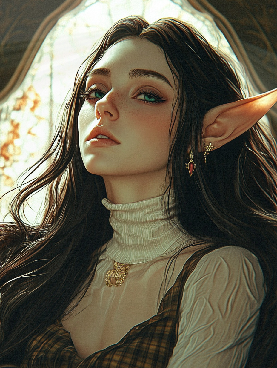 Conventionally attractive. Delicate facial features, high cheekbones, full lips, slightly upturned nose, long pointed ears, subtle freckles on face.