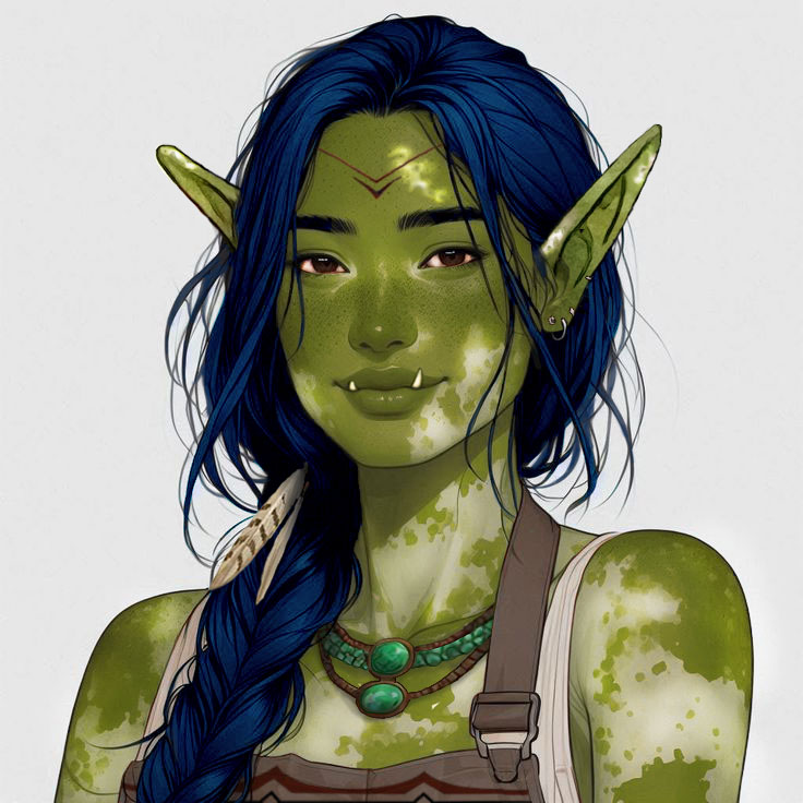 Kasa is a 5’6” Orc female with dark blue hair, dark brown/red eyes, and olive green skin covered in pale vitiligo patterns. She’s on the small side for an Orc, athletic and toned but not overly muscular. Her ears are particularly pointed and her tusks almost dainty. They are also a bit snaggletoothed with the left one being a bit longer than the right. All this betrays some mixed human and elf in her family lines.
