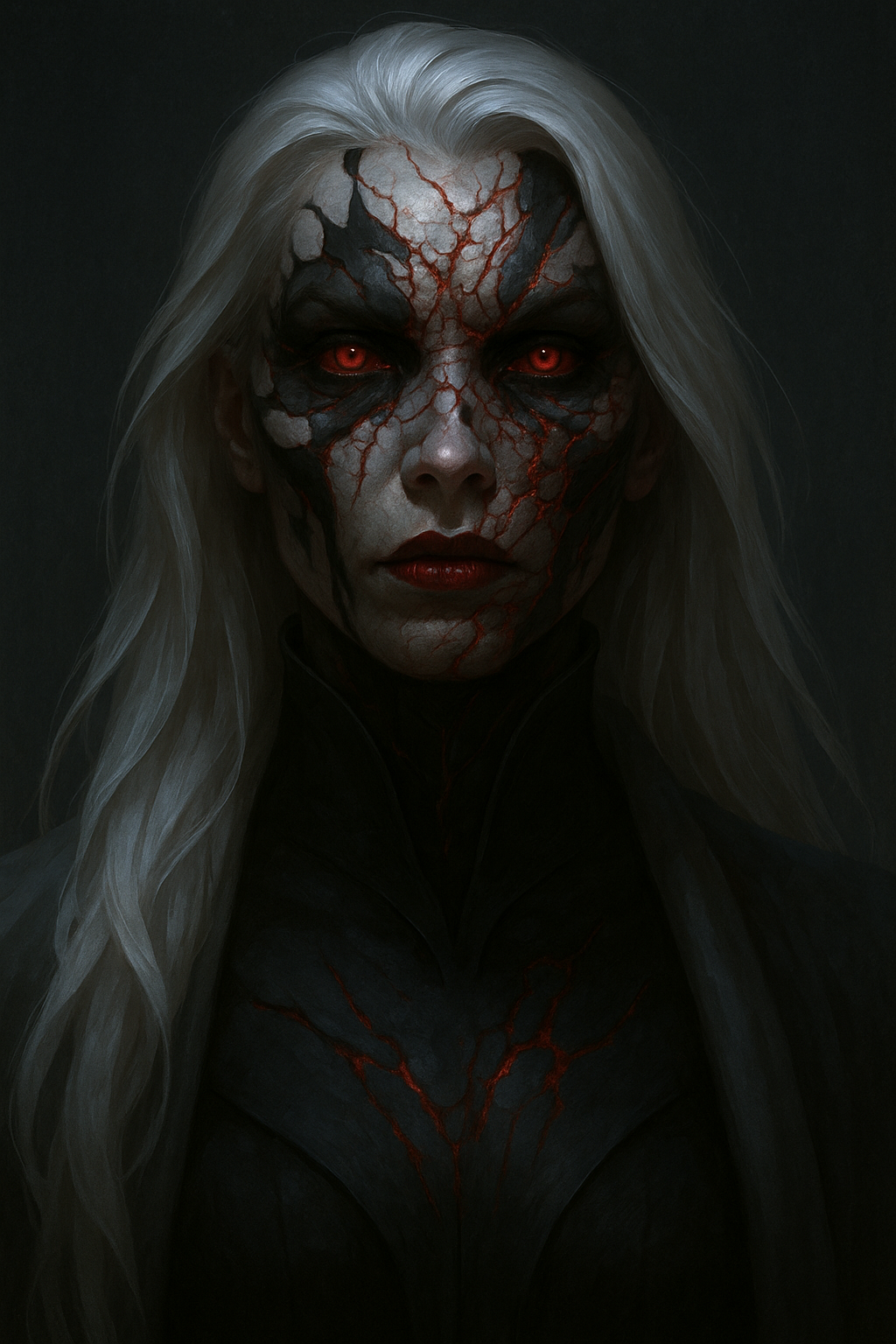 The Sovereign’s face is a mask of glass and ash. Her features, once noble, are now overrun by cracks of darkness and crimson — erupting from her eyes, mouth, and jawline like veins of broken obsidian. Her red eyes are sunken and unblinking, the pupils swallowed by glowing hunger.