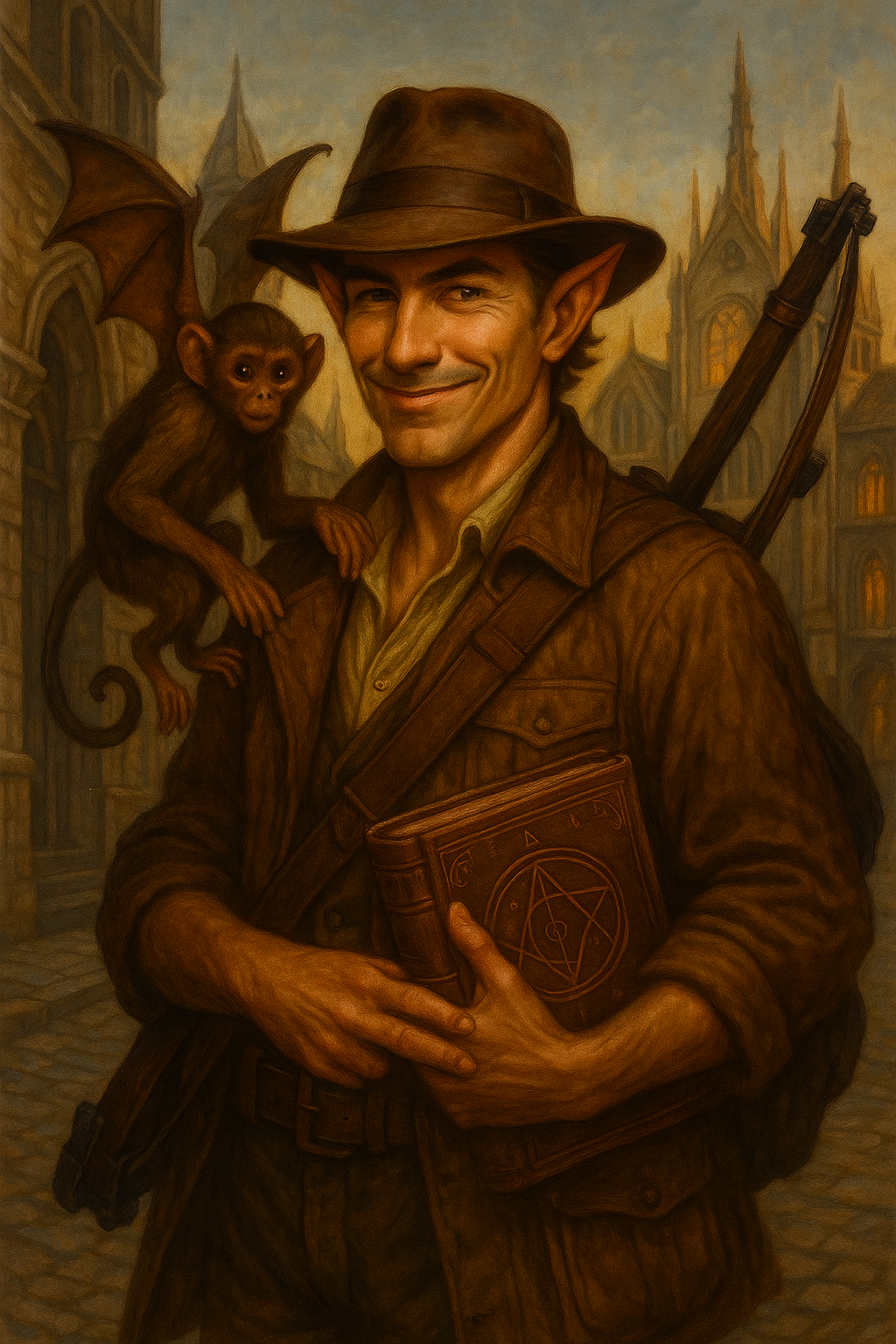 Kwip, his flying monkey Familiar, is more of a friend than a pet.