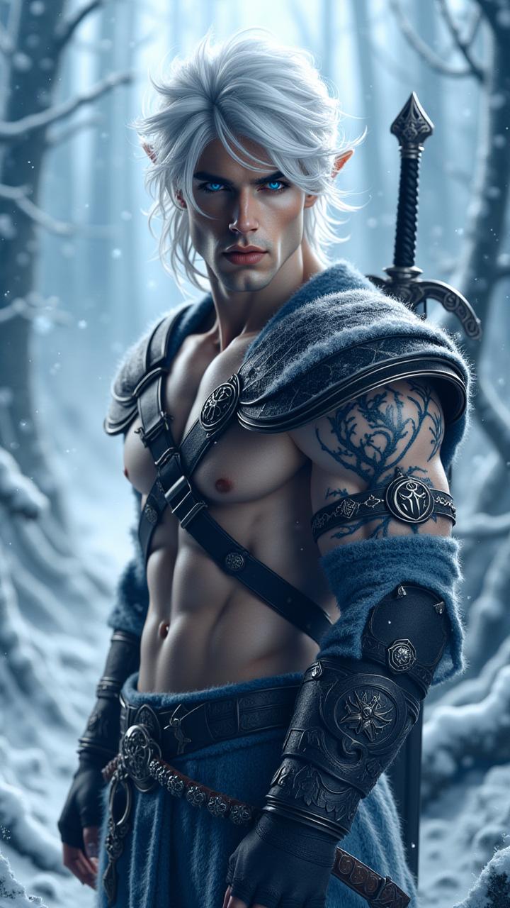 04:38 pm - 01.09.2025Lev in his winter aspect - the season of contemplation and hard choices. His Eladrin nature manifests in both the ethereal beauty of fey nobility and the crystalline determination of one who has seen too much suffering. The snow reflects both his current seasonal state and the harsh realities that have transformed him from prince to protector
