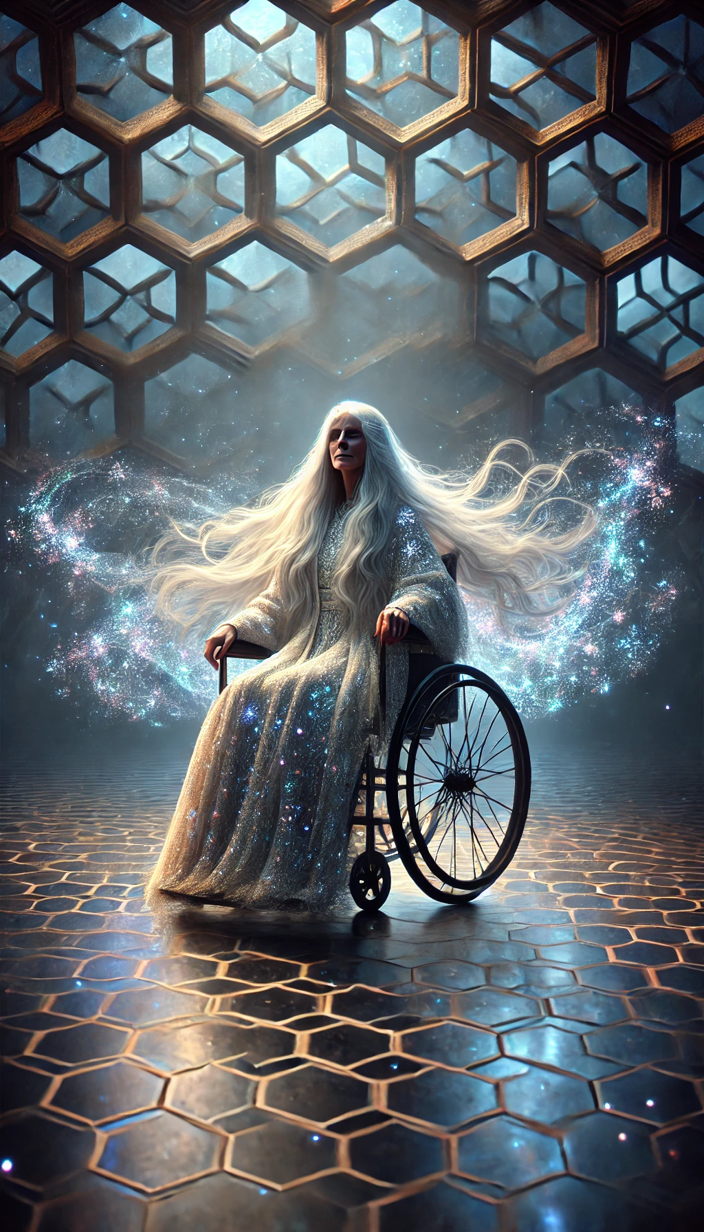 As you begin to describe Aeloria's appearance to the adventurers, you find yourself struggling to capture the essence of her otherworldly presence. She sits in her wheelchair, surrounded by an aura of magic that seems to shimmer and dance with every movement. Her features are ageless, betraying wisdom and knowledge far beyond mortal comprehension.