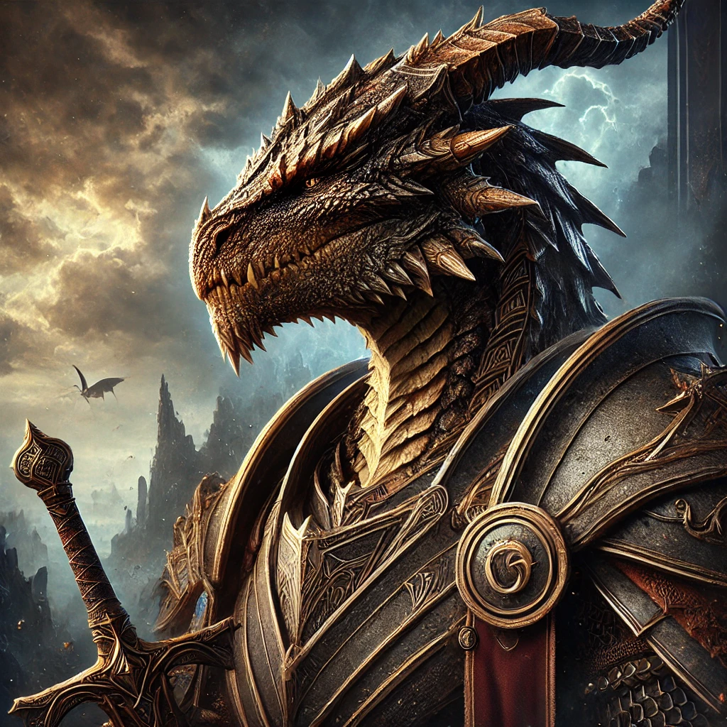 A stoic Dragonborn warrior with deep bronze scales, clad in heavy armor, standing resolutely on a chaotic battlefield with his men on the Frontline. His draconic features and disciplined demeanor capture his role as a protector. Drakaris is revered as a protector, a leader who embodied the strength and honor of the Dragonborn, and who led with integrity and sacrifice. Wields a Holy Avenger (Longsword): +3 to attack and damage, deals an additional 2d10 radiant damage to fiends and undead. While wearing Plate Armor of Invulnerability: Resistance to nonmagical damage and the Shield of the Faithful: +2 AC, can cast Shield of Faith once per day. He is deadly on those front lines against whoever is unfortunate to face him.