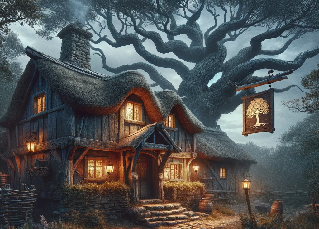 The Shadowed Oak Inn is a sturdy, two-story building with a thatched roof and weathered wooden walls, nestled at the edge of a dense forest. The inn takes its name from the massive, ancient oak tree that stands sentinel outside, its gnarled branches casting long, eerie shadows over the property. A wooden sign depicting an oak tree hangs above the entrance, swaying gently in the breeze and guiding all those who live in Mareford .Surroundings: