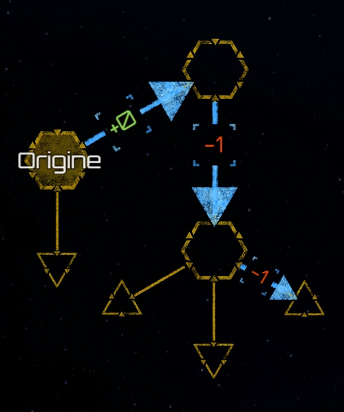 Dans l'exemple ci-contre, notre datadjinn tente de prendre le contrôle d'une machine en bout de réseau. Celle-ci ayant 2 nœuds entre elle le point d'origine de la datadjinn, toute action subit un malus de -2 .