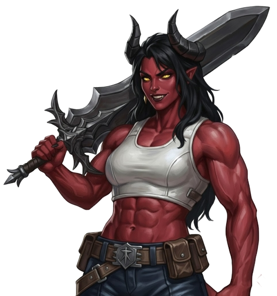 Dust billowed up around polished black hooves. As the violet rift snapped shut behind her, the newcomer straightened up, dusting off a tight white tank top that did absolutely nothing to hide her crimson skin or the impressive musculature of her arms. A long, spade-tipped tail flicked behind her, agitated, slapping against the greaves of her armor.