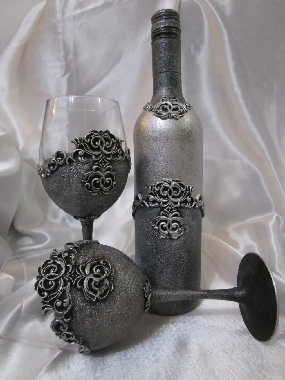 Diese Flasche nebst Gläsern für Morgain, wenn es geht mit einem Akzent in ihrem Ganggrün.