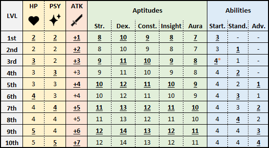 * You can choose a Subclass at Lvl 3. If you take a Subclass, you gain that Subclass Starting Ability instead of the last one of the primary Class. You can alway choose a class abilities with a lower requirment instead (Standard instead of Advanced). You can choose a Maturative Species Ability instead of an Advanced Class Ability.