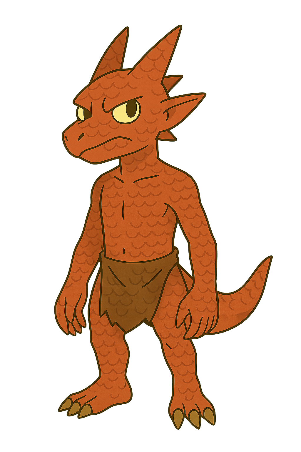 Physiology : Kobolds are small reptilian humanoids with long snouts, clawed hands, and scaled. Their scales range from earthy reds and browns to greens, greys, or even dull gold. Most stand under 4 feet tall and are lightly built, with sharp teeth and glowing eyes adapted to total darkness.