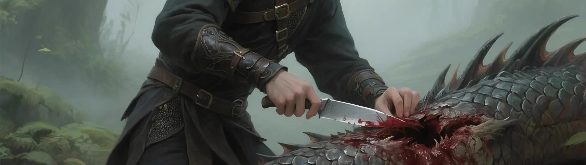 Il est possible de dépecer des créatures si le groupe choisit de passer 1h à Travailler dans ce but. Un des personnage est alors assigné à la tâche et lance le jet (on ne peut dépecer des ressources magiques et ensuite des Rations sur le même corps)
