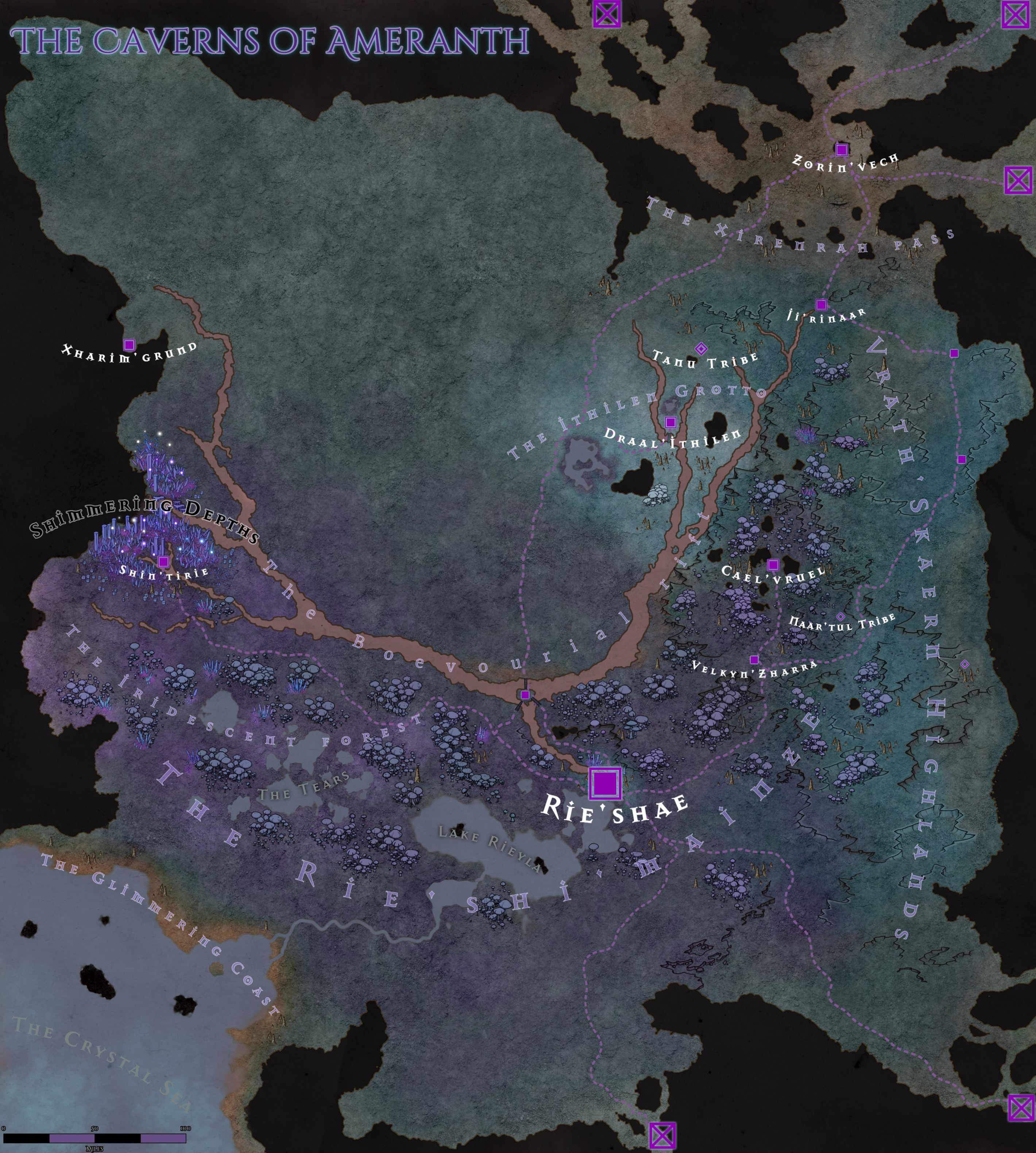 Amaranth is geographically made up of a vast series of large interconnecting cavern systems and extensive caves, broken up by The Borvoural Rift. A geographical fault that split the region in two centuries ago. Dividing Amaranth into several distinct regions, each with their own unique features. From the large open plains of the Rie'Shi'Mainze, to the volcanic vents and hot springs of Shira'kai, to the forboding forests of the Vathiranei. Within each region there are many different areas of interest and dangers to explore.The Rie'Shi'Mainze.