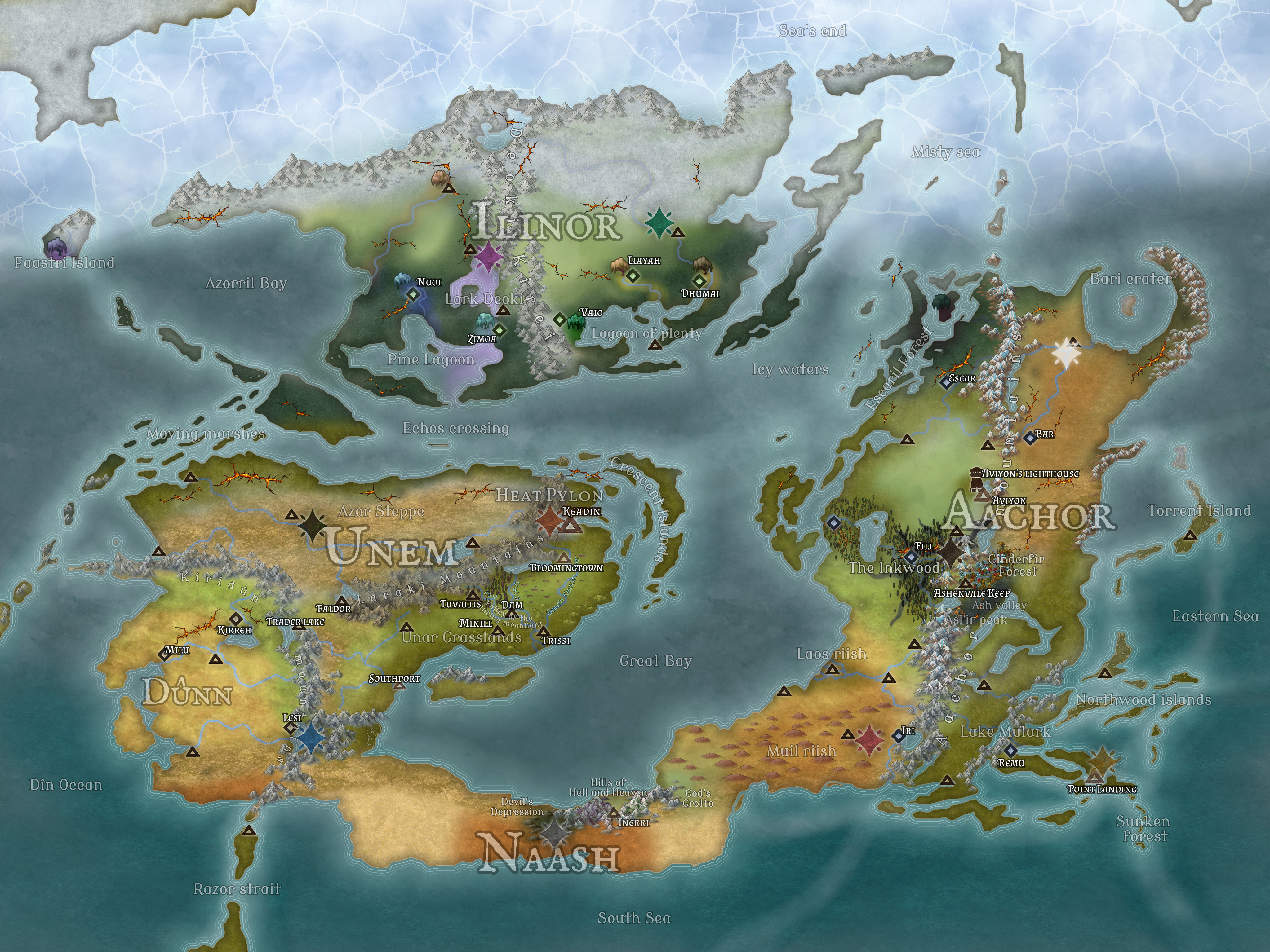 This map shows the world of Ûnduleah about 250 years after the Silver Rain. The diamond-shaped icons are the towns that were present during the Cold Age. The triangle-shaped icons are the new towns that popped up after the Silver Rain had warmed the world enough to allow living away from lava rifts. The big shining diamond-shaped icons are the Celestial Crystal Pylons that crashed down during the Silver Rain. Imbuing the world with magical properties.