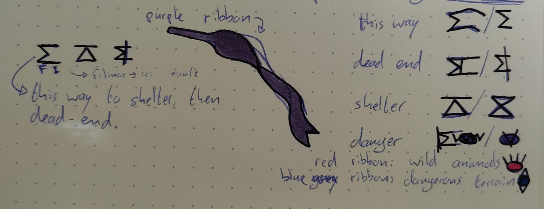 If you are ever lost, you'll praise the heavens if you see a purple flash in the distance. It probably means there is a wayfinder ribbon somewhere, and next to it, markings of the area. Wayfinders periodically hung purple ribbons in highly visible places to mark the way they came. Near these ribbons, markings were carved to give more context. The markings usually had a simple structure, with an arrow and path symbol to show the direction of travel. If a wayfarer found a dead end, they'd come back and alter the symbol. Shelters, too, are marked by a pink ribbon and a symbol. For dangerous terrain and animals, a circular symbol was used to stand out from the angled route symbols. Red and blue ribbons were used in places where extra care is required. Below a few of the most used symbols are schematically shown:True wayfinders and Pathmakers