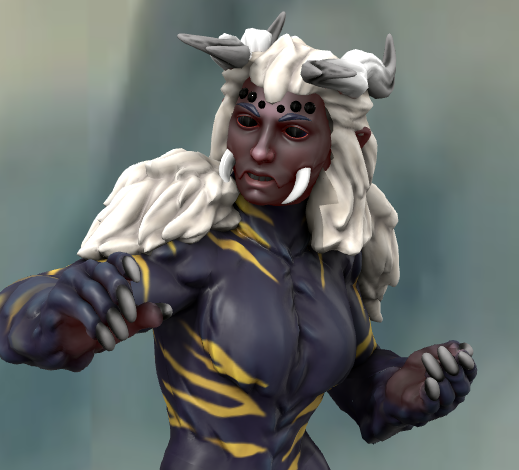 With the lower half of her body resembling an Orb Weaver spider and a furred, Human-like torso where the head would be, Argiope has a total of ten limbs; eight legs and two arms. Her hair and skin are purple-black with yellow striped markings, except for the long hair upon her head and shoulders, which is silver in colour. Her spider legs have three claws on each foot, and her fingers are similarly clawed. Upon her head are two sets of smooth horns that separate out into two slight prongs. Argiope has a spinneret on her abdomen from which she creates her silken webs.
