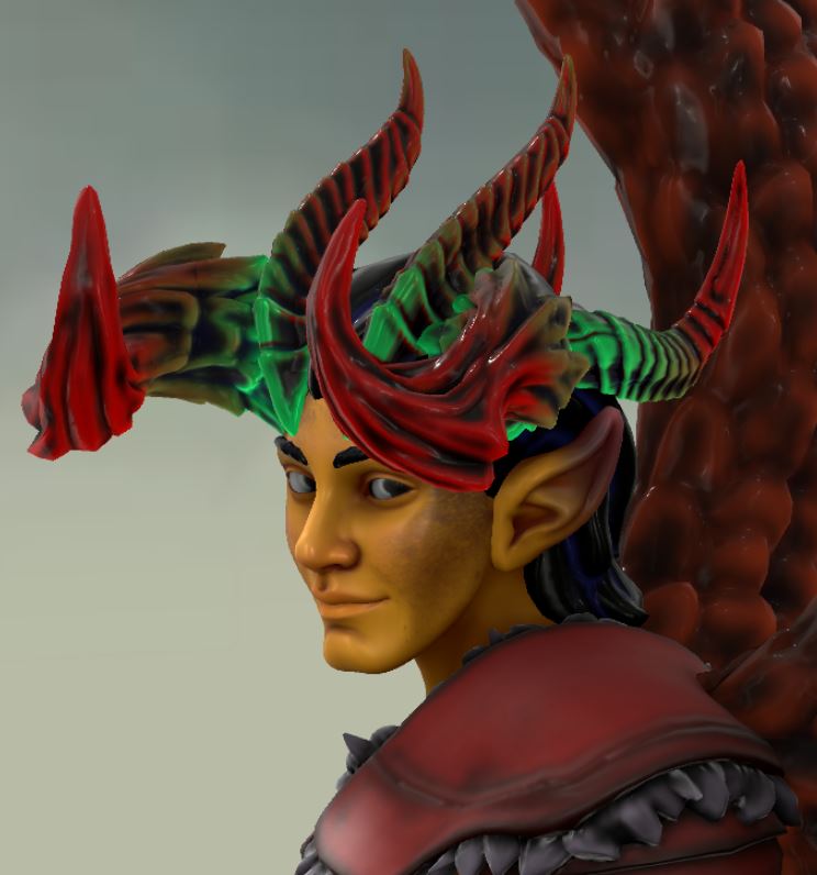 Azazel appears as a tall, golden-skinned Sapient with mottled black in a roan-like pattern across his body. He has black hair, black eyes, and black-feathered wings that glimmer with tones of green and red. His head is crowned with three pairs of black, red, and green horns, his fingernails are clawed, and his tail is finned like that of a dragon. His wings and horns are black with red and green tones across them, and they have a glassy appearance to them. His hands and feet are engulfed in fire that burns red and green, and he wears barely any clothing; enough to keep his modesty intact by Mortal standards, at least.