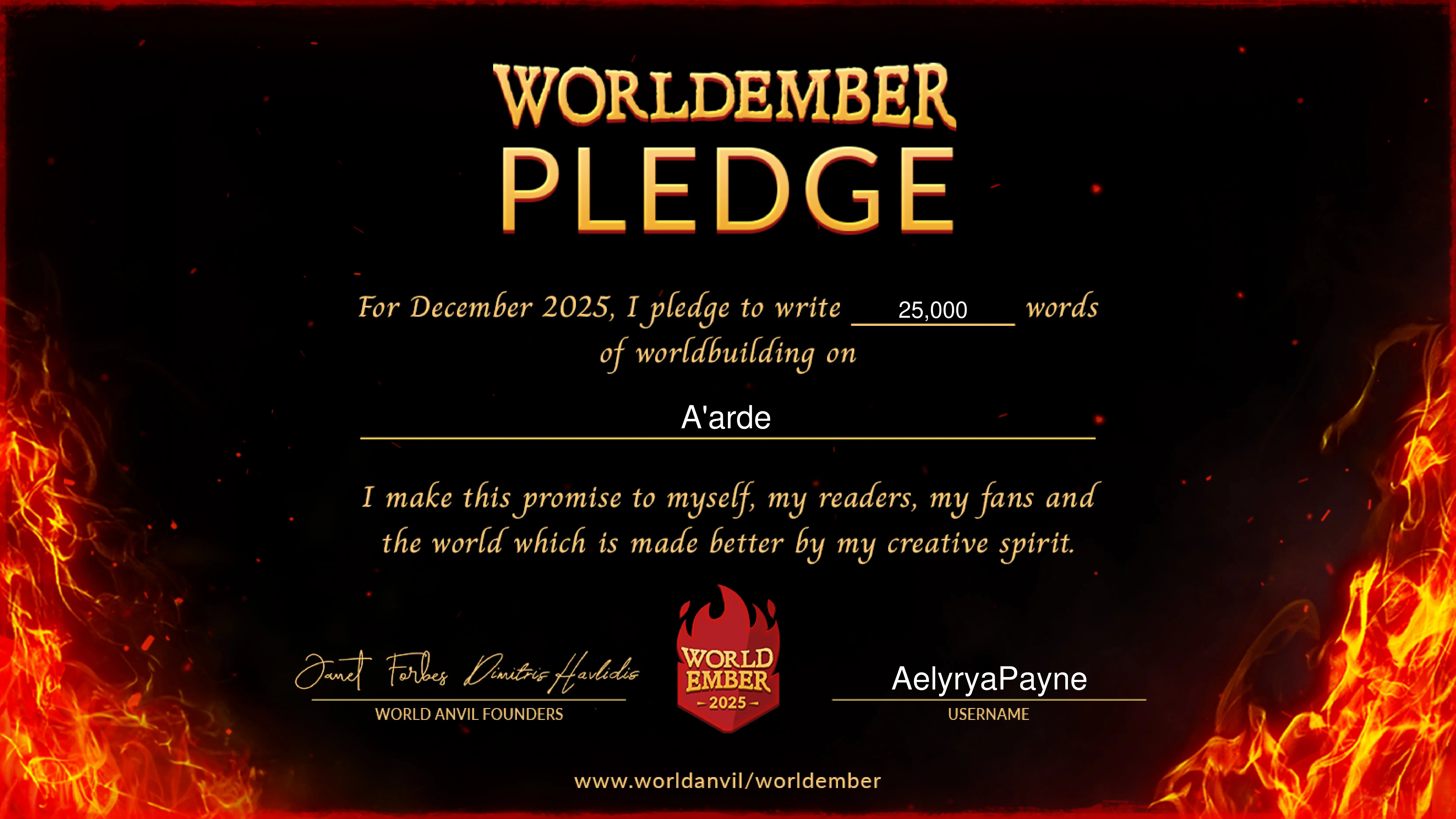 This will be my second WorldEmber, and this time around I am going to challenge myself more than I did for my first. I'm going for a bigger number of words, and I'm planning on tackling a part of the world that I haven't really touched on properly before! Last year I managed 12,074 words. This time, I want to go for the 25k milestone!