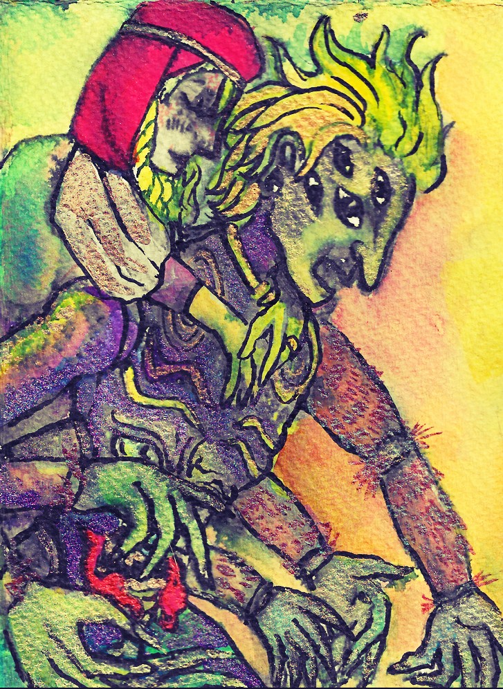 Bleddynia’s entire body felt cold and sterile as a fellow Vespula prostrated themselves to a Kubeleyan God. Although his wording seemed humble and contrived, she could sense by the way the pheromones in their air became ignited between Rodoric and the presence in the trees, touching the mycelium below and surging through the drunks into the breath of leaves. There was something deeper behind those words. This was supplication she had never expected from anyone but a Bride of God, and he most certainly was not. It was some other woman, a Gvaneti, who wore a red hood…