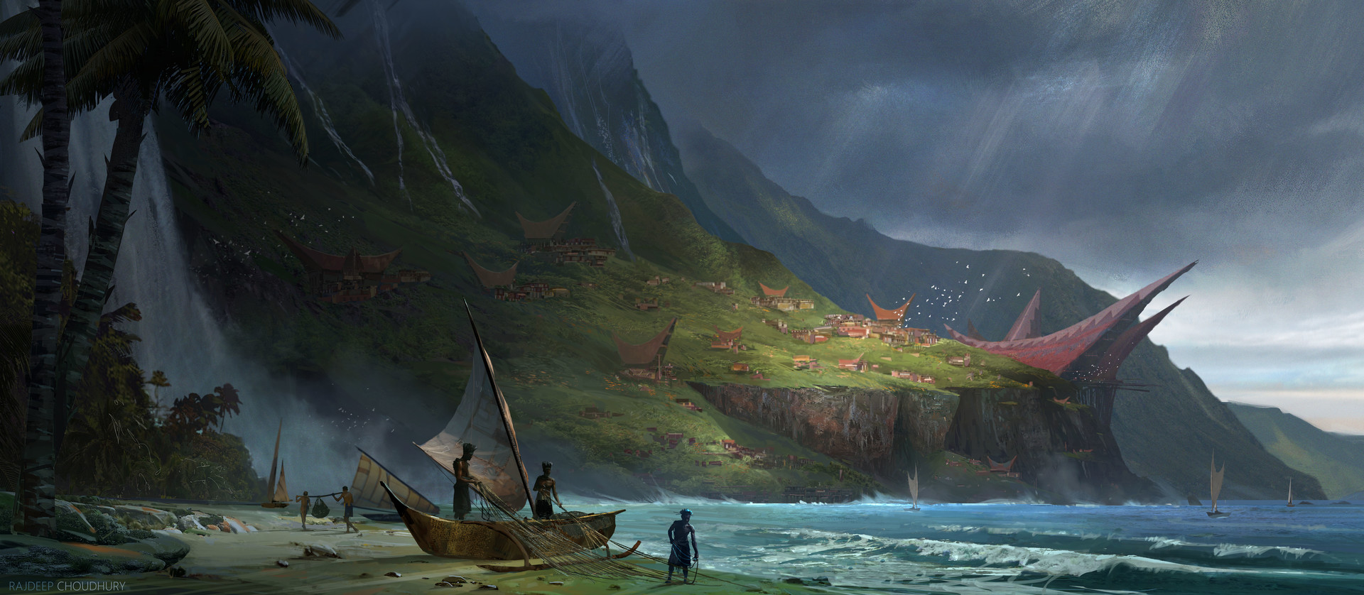 Each ship of this vast fleet is richly decorated with carved and woven stories depicting the legacy of the Haragutai. The choice of story usually indicates what the craft is supposed to signify. Families grieving for lost members might show tragedy of the demi-god explorer Whakari and his hopeless fight against time. Others might seek to display their achievements and chose to show one of the great Takahika or Storm Kings and their conquests.
