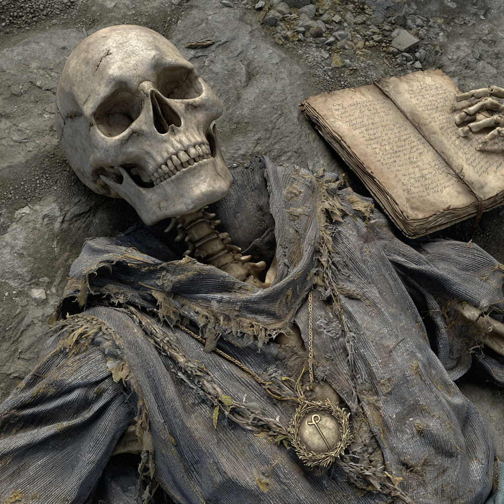 Clutched in the hands of a Thalen's skeletal hand is a tattered and torn journal.