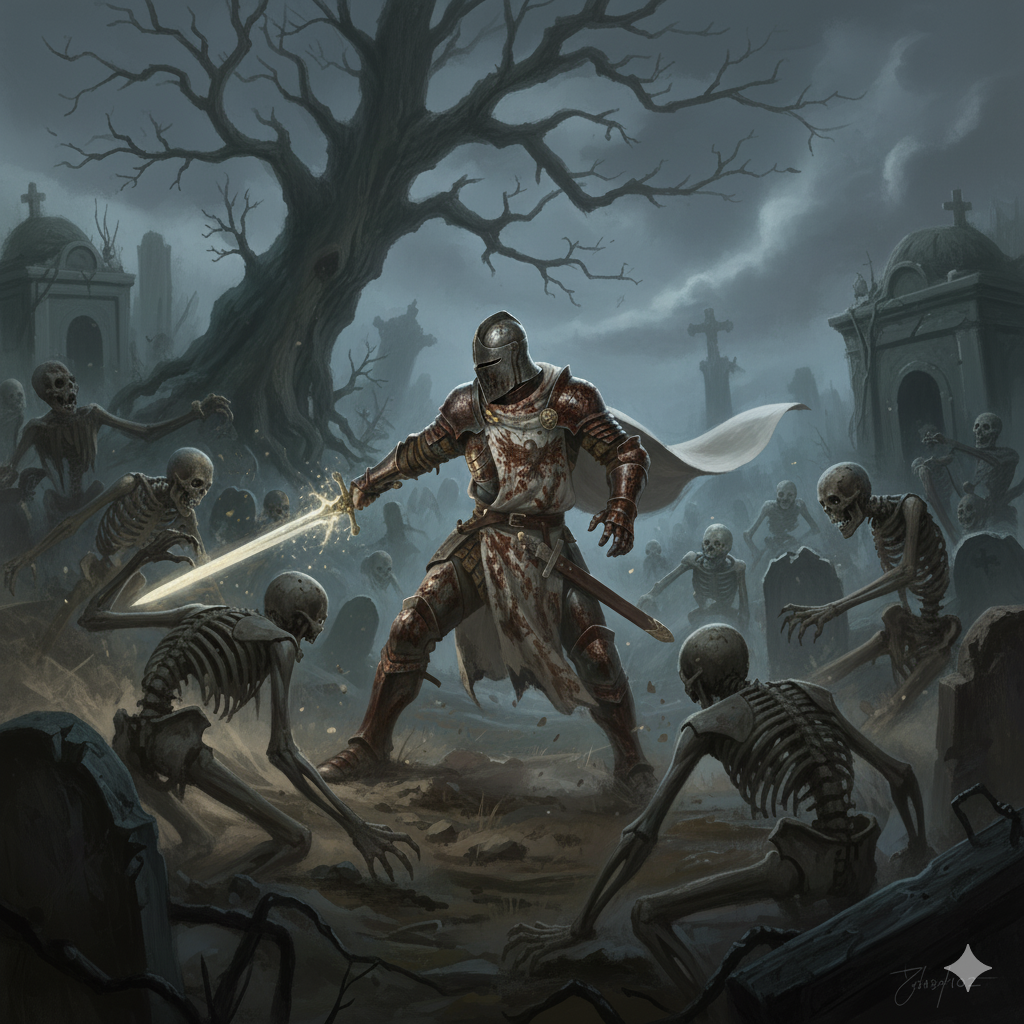 Reprenant son souffle, elle repousse le cadavre putréfié affalé sur ses jambes et, dans un ultime effort, se relève en poussant un long gémissement, son épée d'une main, l'autre tenant son ventre où sa cotte de maille était maculée de sang. Bien qu'une vingtaine de squelettes se trouvent déjà à ses pieds, plus du double continue encore à affluer vers elle, déambulant à travers les caveaux et les arbres sinueux.