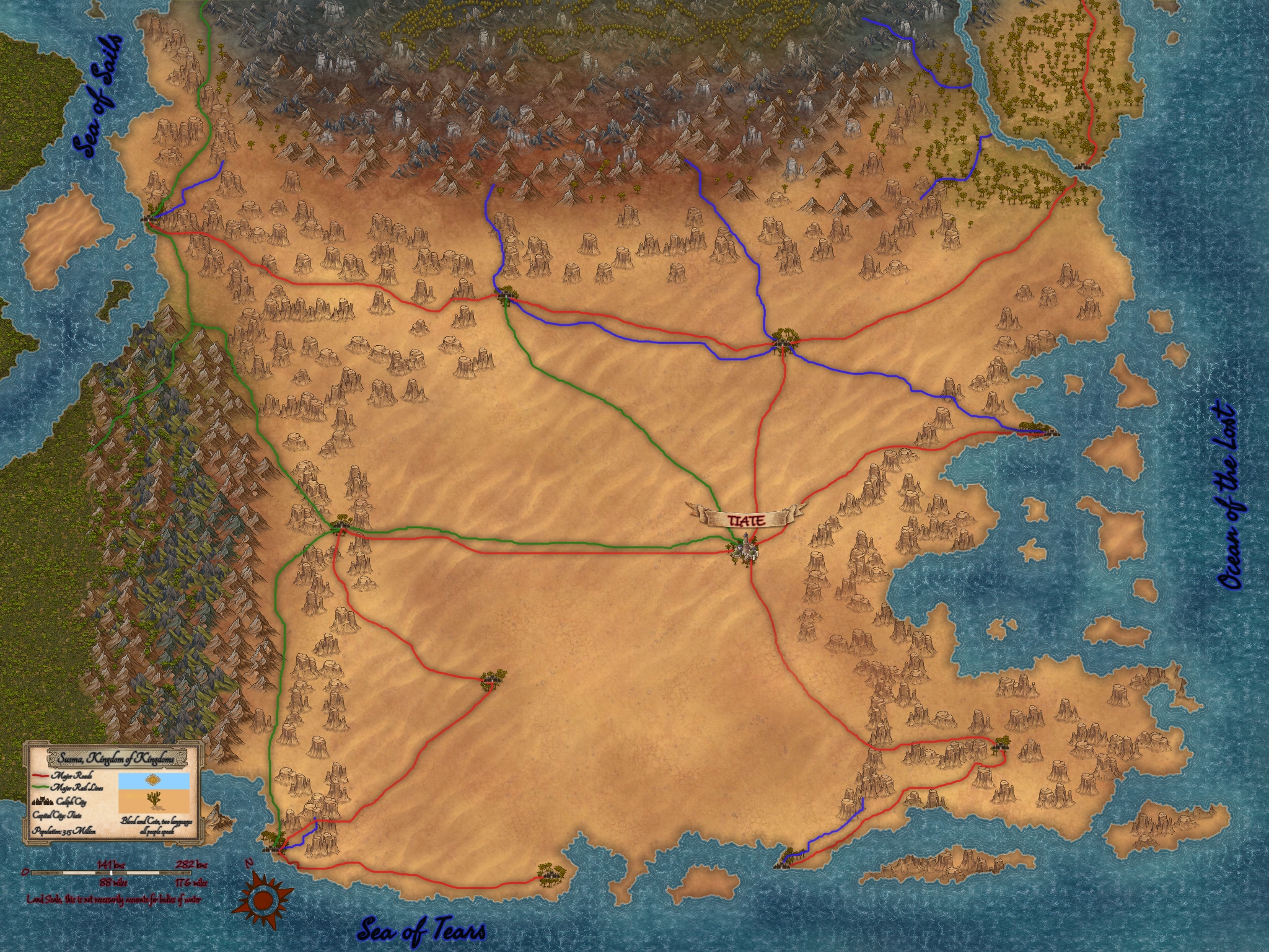 Thus was it that the twelve Caliphs came to be. The merchant principalities that now make up this kingdom of kingdoms, each of their founding cities built and raised and run around the twelve largest and most consistent of these Oases, ones that have not ever run dry, though every dry season does see them shrink, see hardship and difficulties. Trade is not merely commerce in Susma, it is life, it is blood and water combined it is not only luxury but necessity. Commerce is life, without it none of these 'kingdoms' within the larger region could survive. No one city could survive. Thus a culture has grown. A strange blend of fiercely independent mercantilism combined with a fierce almost nationalistic pride. A nation of spirit and commerce unlike the world has known. Susma is not unified and the mercantile kingdoms oft have spats and disputes, even conflicts, with battle and bloodshed. Yet they all hold court to, and sway under the great jewel of the sands, the city built around a true paradise, shrouded by the great dunes and dangers of the Bala. Tiate, the seat of the greatest of gambles, the city of monuments, carved out of the sand around a veritable paradise. Here isolated from all, yet with dominion over them, is the seat of the Shah, the rulers of the sands.