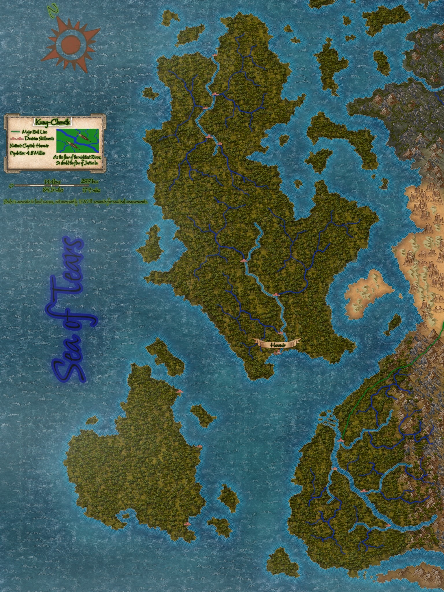 The hours pass and other boats and vessels you pass along the river. The Lotzi varies noticeably between the wet monsoon season and the drier summers, reaching widths of some thirty to forty kilometers wide at its widest points and easily averages fifteen to twenty basically along its whole length. It is a vital highway of transit and trade. Eventually as the mist of morning begins to fade, the sun over the canopies now and the humidity of the jungle bringing sweat to your brow, as the ferry vessel rounds a bend, you see in the distance what you were waiting for. Where a smaller river feeds into the Lotzi, joining it on the journey to the sea, a city can be seen. The jungle cleared back from it quite a distance, no real walls of fortifications heavily present of course, the city itself quite large. The Chorathians do not utilize walls in their settlements, relying instead on communal efforts and militia to protect their settlements, as well as the thick jungles and terrain to protect them from invaders, at least inland. This strategy seems to work for them quite well, though it does help how isolated the nation truly is. No real modern roads exist here, and only but one rail yard, connecting a city further up the Lotzi to Susma. Of Sky-ports there are but two, one in the nation's capital of Haramir, the only settlement that is fortified with any sort of walls or otherwise, so says our guide. The other, Blackfish Bay, on the frontiers of Holoru Island, the least settled region, the frontier of the nation.