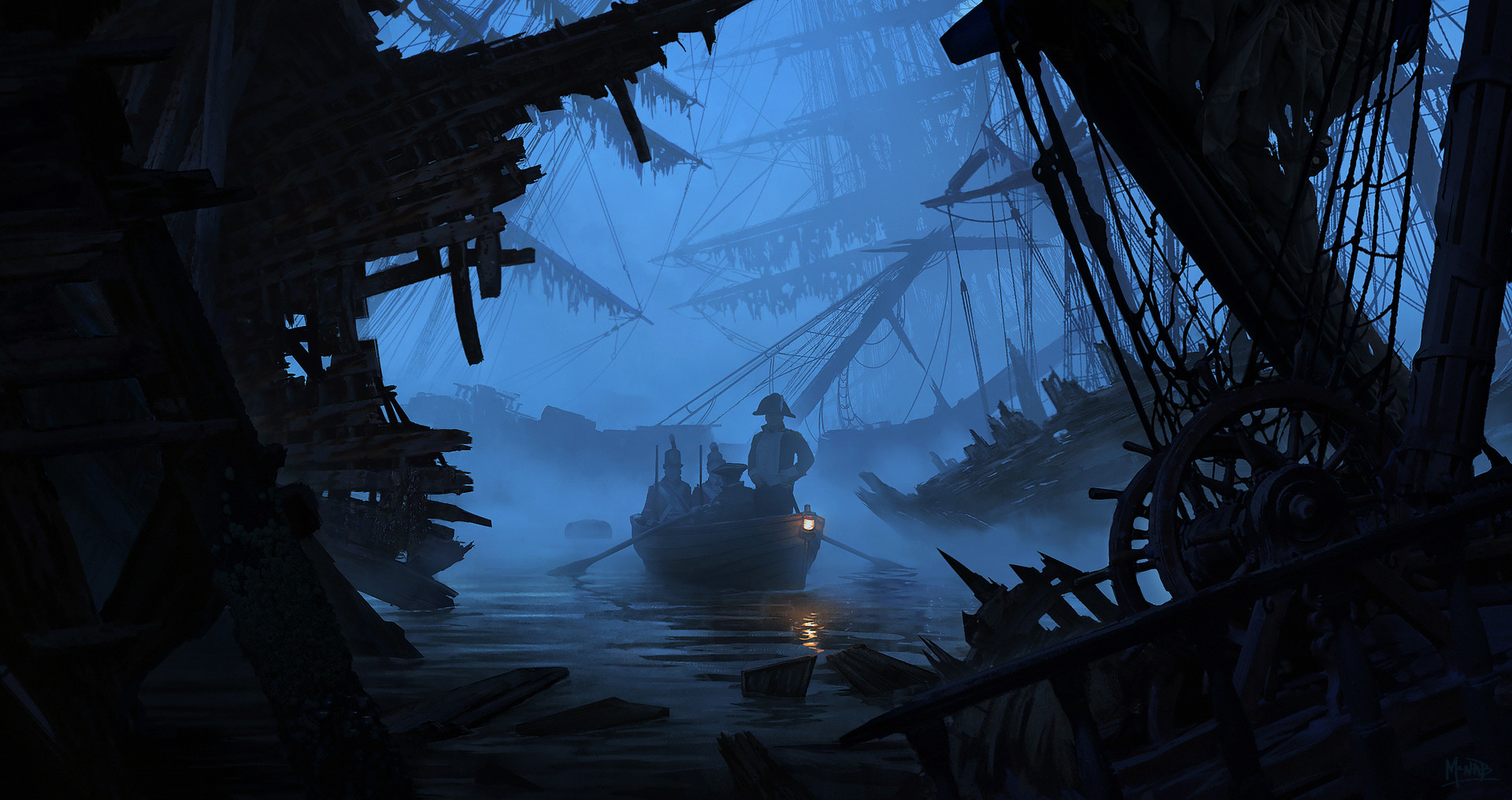 A rescue party from Albatross City sails through the graveyard of ships around Reveler's Vineyard.