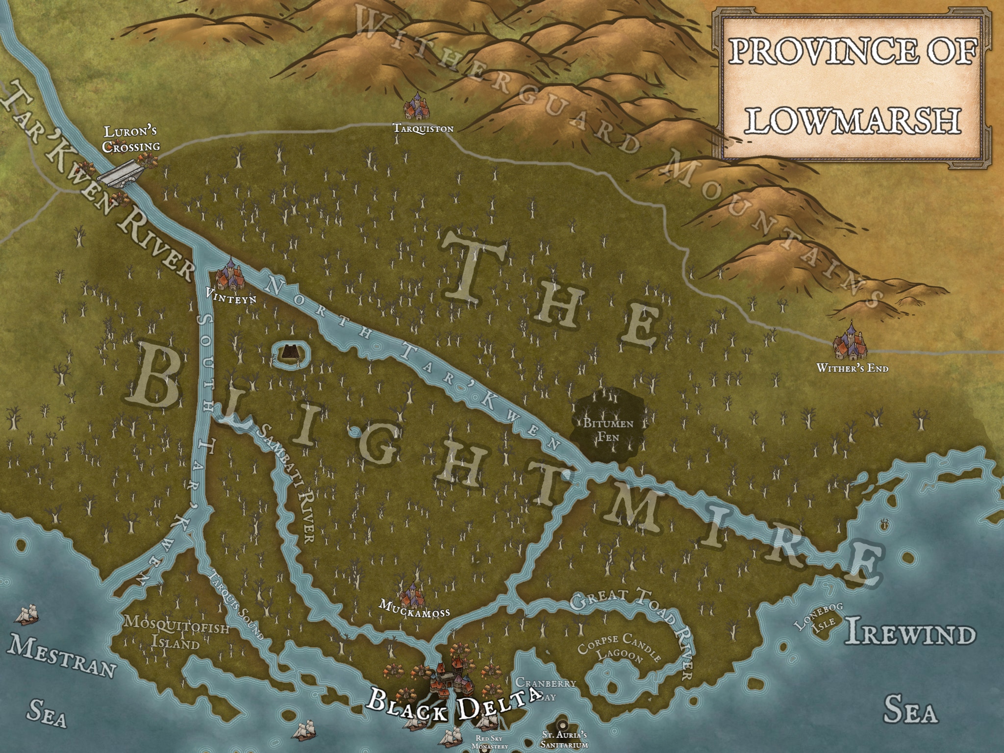 The Tar'Kwen River that begins far to the north in the Great Halfmoon Lake splits into several smaller rivers at the entrance of the Blightmire, and then rejoins in a muddy fertile river delta, flowing into the Mestran Sea. The city of Black Delta is built upon these lush shores, with hundreds of farms spreading out from its palisade walls, taking advantage of the dark fertile soil.