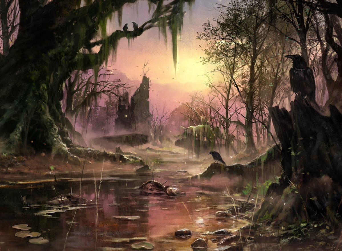 Crows pick at the remains of cadavers stuck in the tar of Bitumen Fen, a sticky deathtrap in the heart of the Blightmire