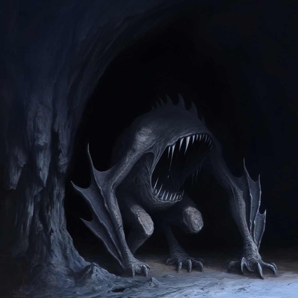 Continuing along their path and taking a wide berth around the ravine, the group made it another several hundred feet before Toban and Shein could make out the heat signatures of what appeared to be people up ahead. Two of them rose from a seated position and trained bows on the party, appearing to look right at them, despite clearly being of Human or similar height, while the third drew a sword and began to advance towards them. The party, unsure of what to do, tried calling out to these unseen figures, but received no response, and only saw the figures nocking arrows and crossbow bolts in response. They persisted, trying to reason with these figures, until one of them appeared to loose an arrow, after which the group heard the sound of something striking the ground behind them. Shein decided to throw a dagger at the archer in response, but despite being certain of his aim, he heard only the clatter of the dagger hitting the ground in the distance. Hoping their assailants were just beyond the Shroud, Rainer decided to pull out his Bullseye Lantern and proceed forward to shine it upon their would-be attackers. However, as Shein moved forward to lead the group out of the Shroud, he suddenly fell off of a cliff and hit the ground hard. Rainer hurried forward and tossed down a rope to Shein, who suddenly saw a giant form of some manner of creature swoop through the canyon he had fallen into past him, as if trying to attack him, before flying off into the distance and out of range of his vision. He began to frantically climb the rope, not wanting to confront the creature alone, but then Rainer above, who was holding the rope along with Zero, heard a whooshing noise and something large suddenly slammed into his back, nearly sending him over the cliff. However, Zero caught his arm just in time and managed to pull him back. As Shein reached the top, the group took up defensive positions, but without being able to see anything, they were unable to see any threats coming; though Toban and Shein noticed the sudden lack of the humanoid figures they had previously seen attacking them. As the group moved around the canyon, something suddenly swooped down and grabbed Toban, rapidly lifting him into the air. Not wanting to lose track of them, Zero made the quick decision to cast Faerie Fire on Toban and the unseen creature, lining them in violet light, which began to burn Toban as well as the creature. As they followed the creature, they came to the edge of the Shroud and exited, seeing the glowing form of the creature carrying Toban off into the distance over a high ridge. Quickly scrambling to the top, they saw the creature flying off to the side of some sort of large building blocking the passage through a pass. As they caught up with the creature, Shein quickly loosed an arrow, followed by one of Scarf's Flow daggers, causing the creature to drop Toban. The creature then landed in the midst of the group, scorching them all with the light emitted by Zero's Faerie Fire, and they finally managed to get a good look at it.