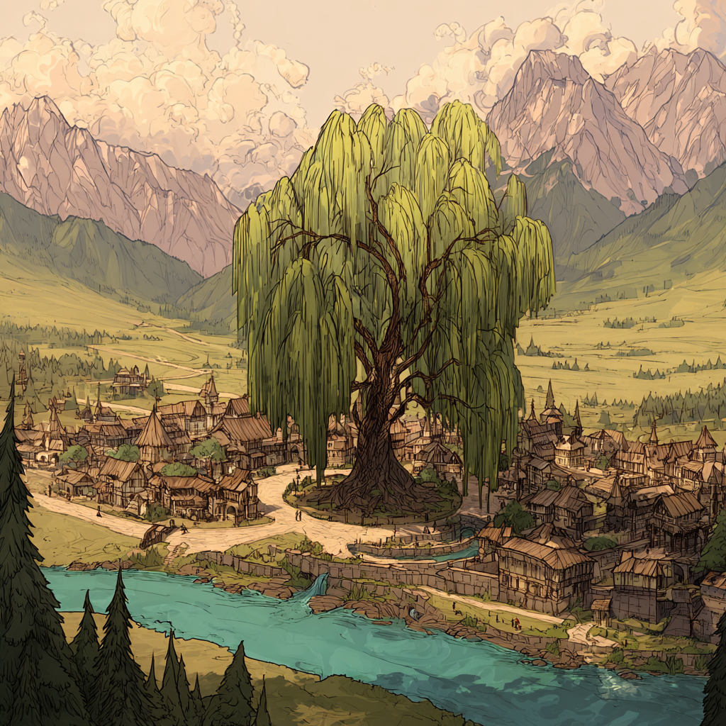 Esharreth is an ancient town dating back to the Age of Creation, founded originally for the abundant resources found in the river south of the town, as well as the mountains to the north. However, those resources have long since been used up, with new resources being too far from the town to be practical to reach. With the town being so old, many have lived and died here; and now the town is known not for its resources, but for the dead who have remained there. These days, the town is somewhat of an attraction to travelers and faithful who consider the area the town is located within, and especially the giant willow tree at the town's center, to be sacred. Not a single resident of the town has lived there without having some sort of spiritual experience, as the spirits of the dead are a common sight here. However, unlike the town of Mospen in Myr, Esharreth has no fear of the spirits within its borders, as despite its extreme age, no corrupted spirits have ever dwelt within, and the spirits the locals are familiar with are passive and even friendly.