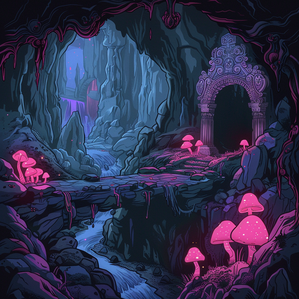 As the party traversed the twisting tunnel downwards, they began to hear the sound of running water, and emerged into a large cavern with a ravine running through it filled with running water. Spanning the gap was a bridge, with Ply Agaric mushrooms growing along it and the cavern walls. Across the bridge were two statues flanking a passage leading to a large set of doors.