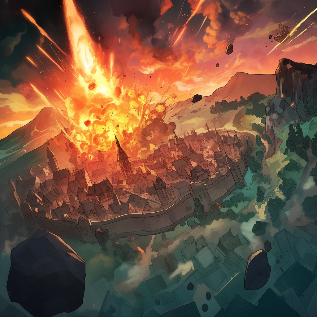Tyllaetha was the first to speak, seeming to recognize him and asking why he was here and where he had been, mentioning she had last seen him when he left the Ars Aurum Academy hundreds of years ago. Adamar seemed to not care to elaborate much beyond saying that he would keep it brief, knowing the party was likely to attack him, saying that they needed to use their damned heads for once and know their enemy, unless they wanted to end up dead next time, before he vanished. The three Cabalites relaxed, lamenting over their stupidity for letting their emotions get the better of them over Kyran's death and charging in their without waiting for information first. After decompressing, Merrick decided to Commune with Orick, and asked about the encounter, and how to destroy Andozar. Orick said that like himself, Andozar was bound to a Soulstone, which preserved his spirit and tied it to his physical body, and that so long as the Soulstone remained, it wouldn't matter if they destroyed him because he would simply return. He said they would need to find a way to destroy it first, and said that only a Soulbinder with knowledge of Andozar's particular brand of Soulbinding could tell them how to do that. He said that the Ettinor of Arak had lost much in their migration from Gothir following the Spellscar anomaly, and if they wanted to find a Soulbinder with this knowledge, their best bet was to head to Gothir. Skinner briefly wondered if perhaps some extended members of his family may still live in Gothir and he could contact them for assistance. After Orick departed, Merrick and Dain spoke about potentially creating items that could protect them from Andozar's scrying, so that he could not plot against them further, and Tyllaetha said that she could potentially help with that. She then said that she would head back to the city and get in touch with Medril to see if he had yet learned anything of Andozar and Nashar and Anael could search for additional help in the fight against Andozar, and suggested the party could get started on their journey to Gothir, but also suggested they should first get some rest. They agreed and set up camp to take a much needed rest on the outskirts of the city. In the morning, as they were packing up their things to go, they suddenly saw a bright light to the north near the city. Initially thinking it was the rising sun, but remembering the sun does not rise in the north, they looked and saw a blinding light looming just outside the city. They felt all of the Flow suddenly rush away from them towards the north. There was a sudden flash, and after regaining their sight, they saw a distant figure that Summer recognized as none other than Andozar. He stood up, seeming strained, before casting a spell and teleporting away. The group noticed the skies had darkened severely and looked ominous, and after a few moments processing what just happened, they saw the clouds above part as a massive rock the size of a small mountain emerged, burning red-hot and plummeting at high speed toward the city. Before they had time to process this, the meteor struck the city, causing a flash and an enormous explosion that engulfed the city, sending out a shockwave that blasted the party off their feet and sent them flying back violently.