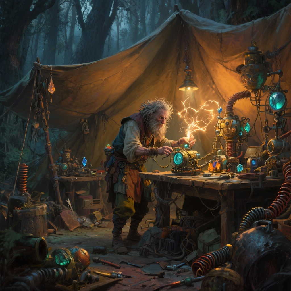 He scoured ruins, scavenged junkyards, raided abandoned workshops, and once tried to dismantle a broken ley-stabiliser while it was still resonating. When he joined the Briar, he did so almost by accident — he had been tinkering with a scavenged mana capacitor on the roadside when a small Briar Knot mistook him for a lost inventor and tried to rob him. Ten seconds later one of their coats was on fire, two were coughing through paralytic vapours, and the remaining bandit blurted out that he knew someone who might “find use” for a man like him.