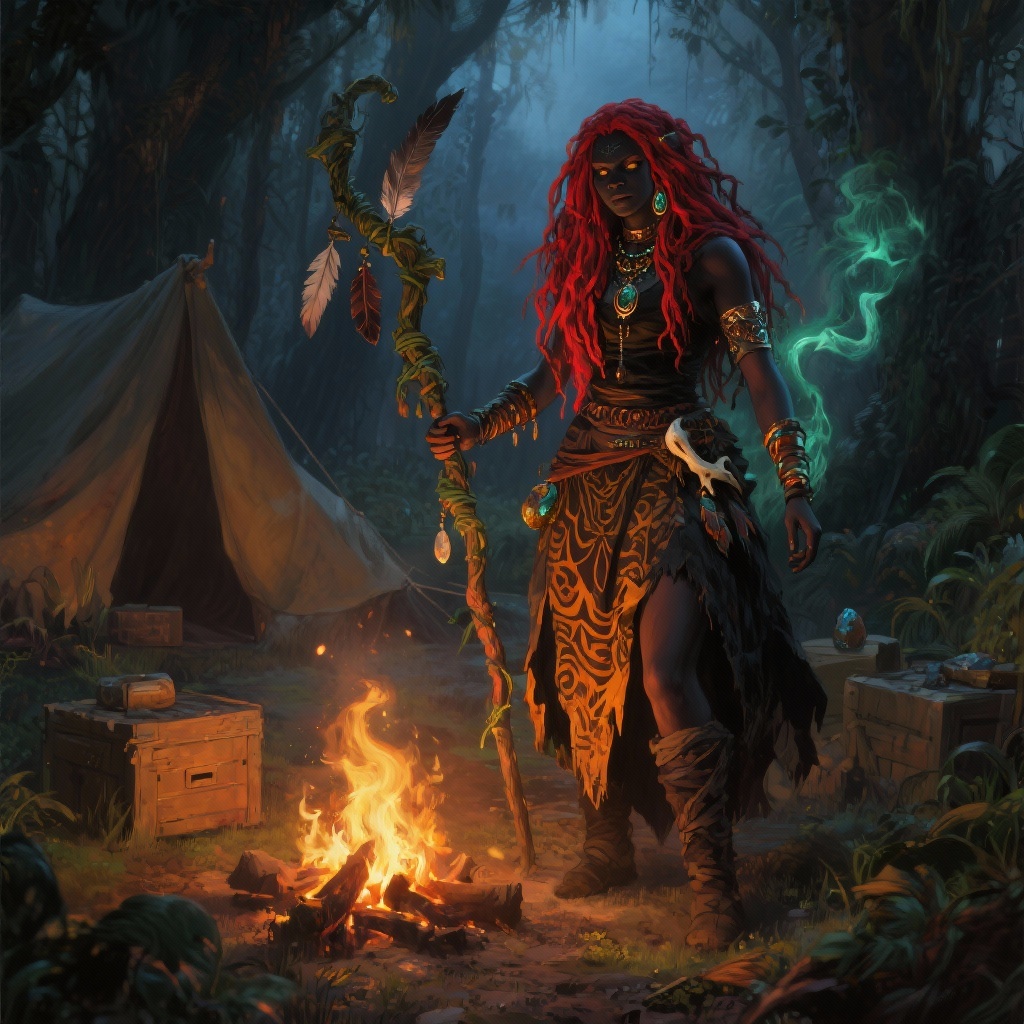 When she travelled north, she did so alone. She carried few belongings beyond the vine-woven totems of her craft and the long dreadlocks she had dyed in mourning red from the pigment of crushed Firevine stalks. Her arrival in Cezorus caused whispers — a foreign witch with bone charms clattering at her waist, her dark skin and striking hair marking her unmistakably as Tzintavain. She welcomed the whispers. Let them stare. Let them be reminded of the people they had harmed.