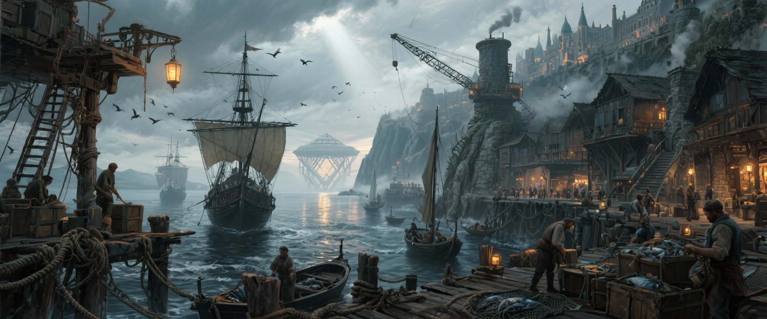Life in the Docks District follows the rhythm of tides, arrivals, and departures. Time is measured less by bells than by schedules — docking windows, auction hours, and shift changes.
